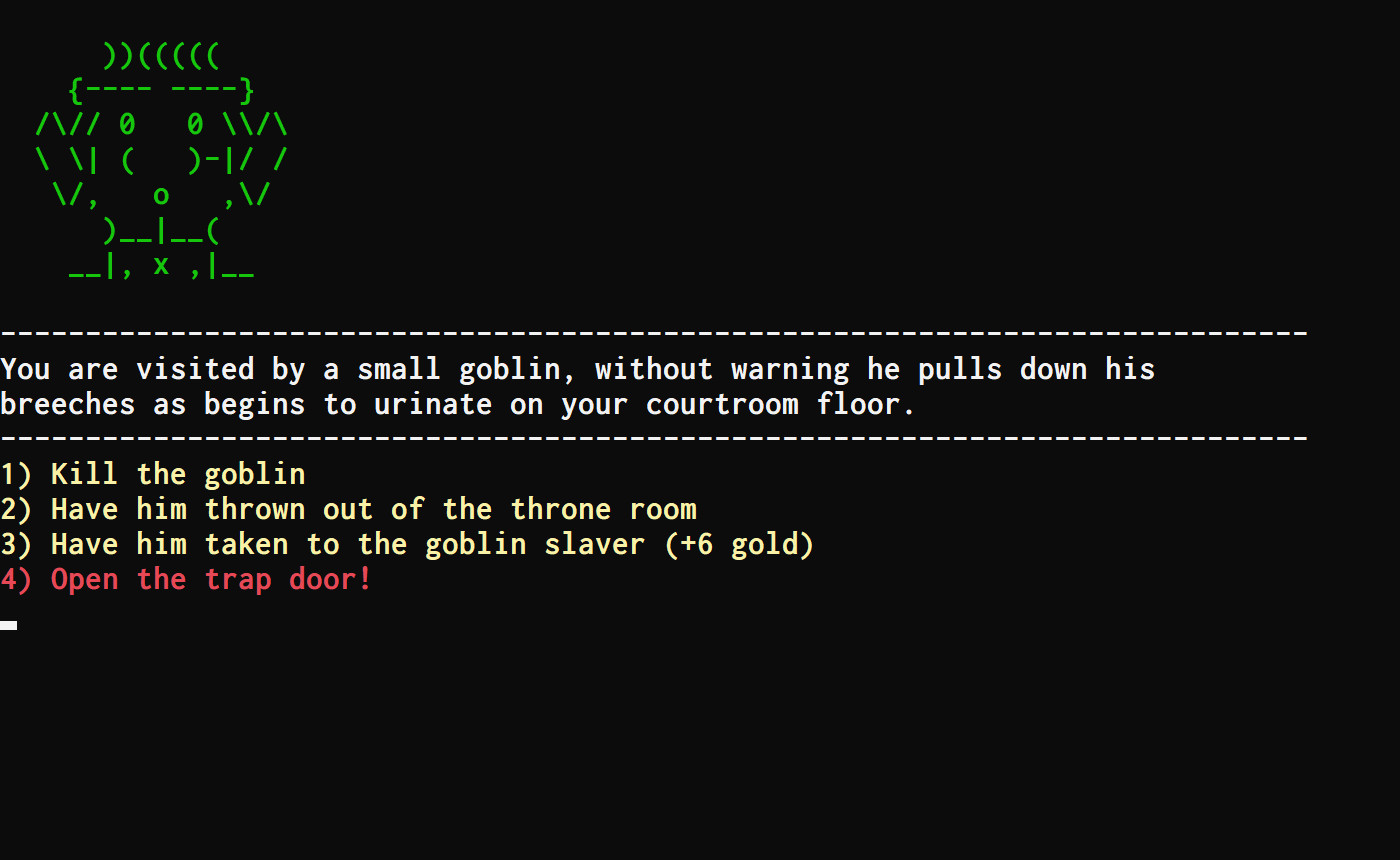 Warsim is a deep, rich text based kingdom ruling sim unlike anything else, complete with charming ASCII graphics. Navigate the millions of different procedurally generated races, events and areas with a huge emphasis on player choice. Don't let its look fool you, there is depth in every direction.