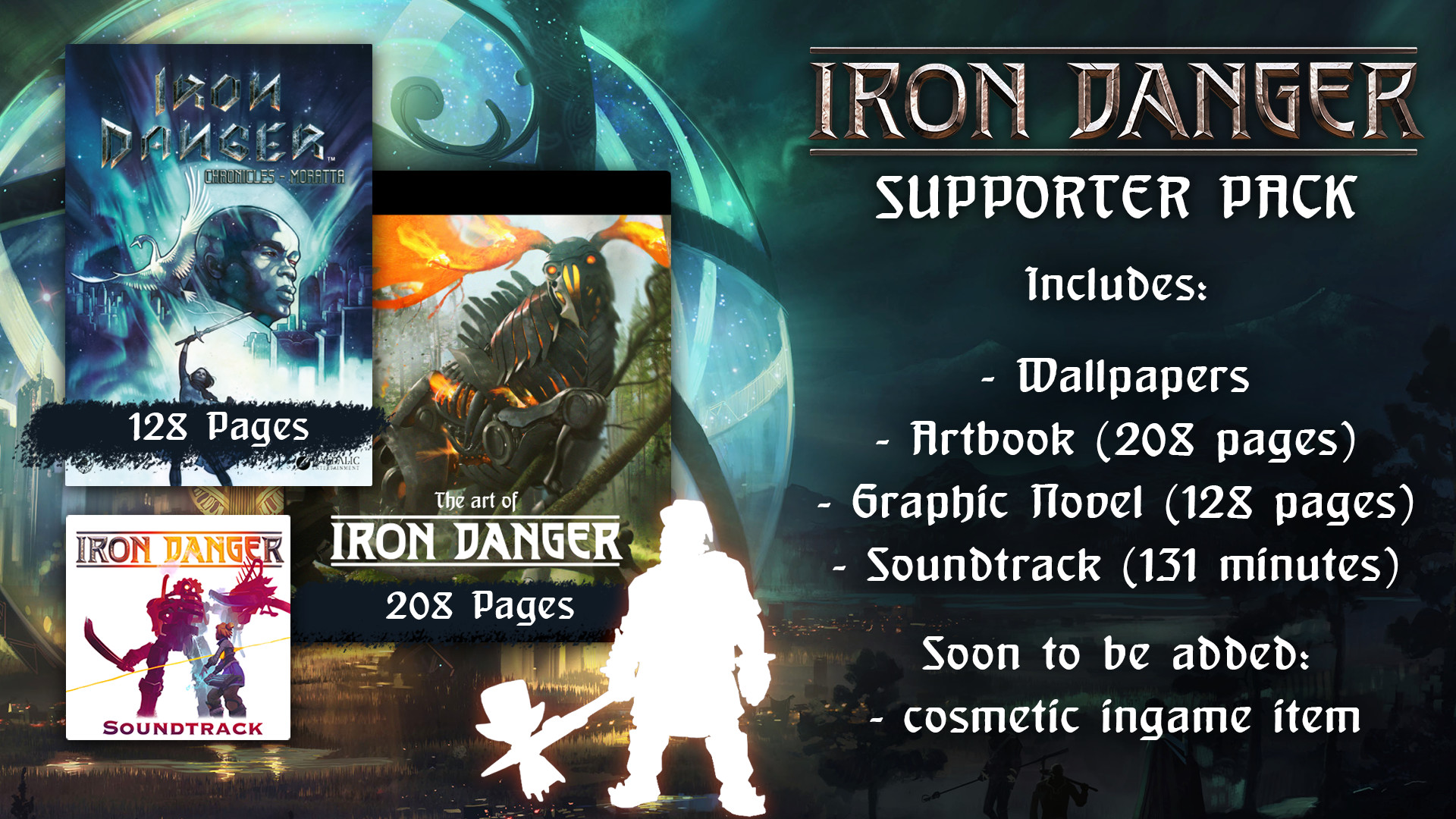 Это комплект всевозможных полезностей и бонусных материалов для тех, кто ищет новые способы поддержать разработчиков Iron Danger. Погрузитесь глубже в мир Iron Danger благодаря артбуку, графическому роману и саундтреку!