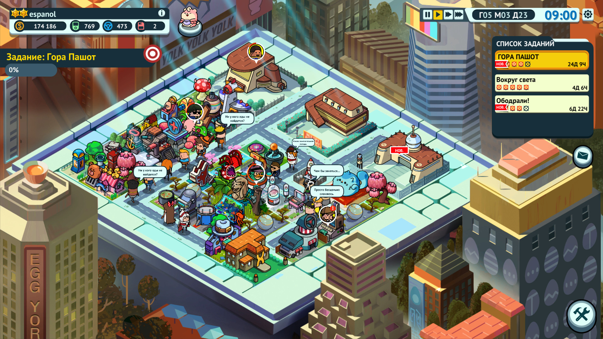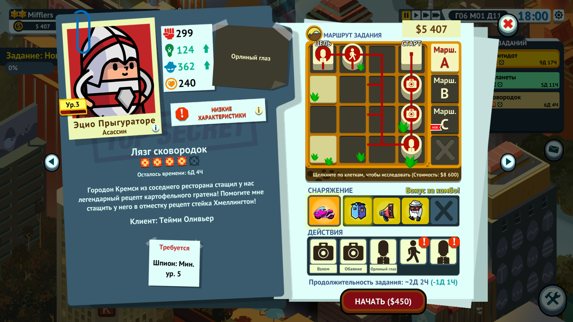 Интересная задумка самой игры, затягивает. Темп игры слишком быстрый, в один момент нужно уследить за каждым и в то же время учитывать время заданий, их уровень и уровень шпионов. Немного смутила система с основными заданиями, мол, если провалил его, то все, давай начинай заново. А если ты уже продвинулся ну очень уж далеко?) Спасают лишь сохранения