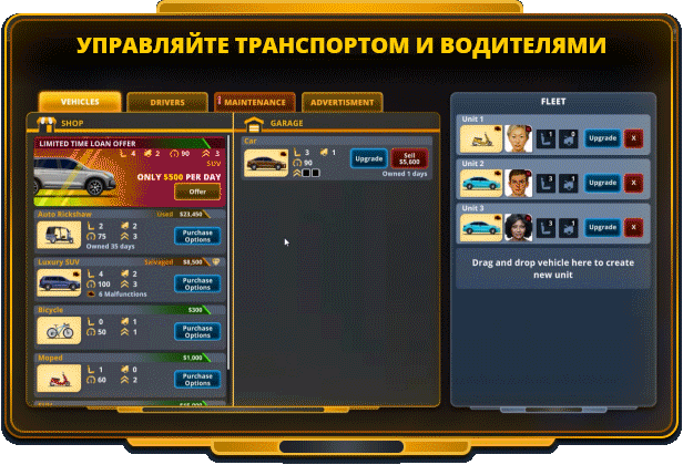 Автопарк и водители – ключ к успеху компании. У каждого водителя есть свои черты характера, которые по-разному влияют на эффективность. У каждого транспортного средства есть преимущества и недостатки. Соберите команду, которая лучше всего подойдет для вашей компании и стиля игры.