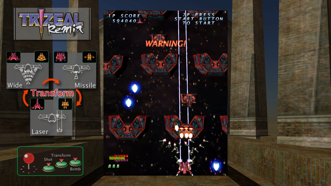Transform or die. TRIZEAL Remix has classic shoot-’em-up style with a refined depth just below the surface. Strategically transform your ship to switch between and upgrade three distinct weapons: a wide shot, a narrow laser, and guided missiles. Shoot with intelligence!