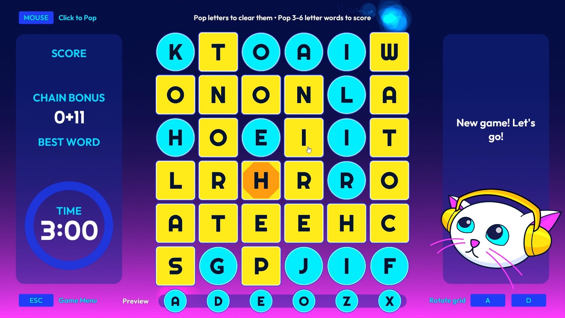 Clear out bad letters on a dynamic grid while rotating the board until you can form a set of words like making a big crossword. Once you're happy with the lit-up words, clear them with a satisfying “pop” that rewards you for bigger word combos.