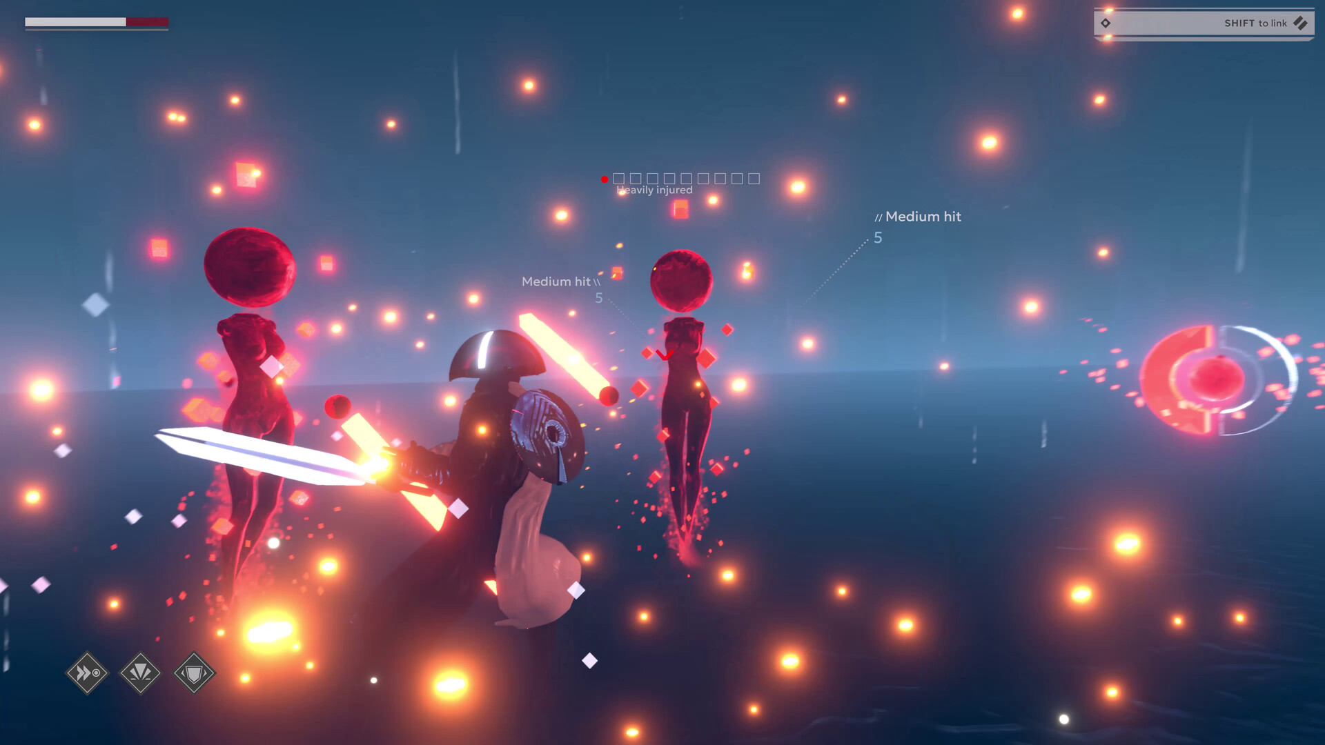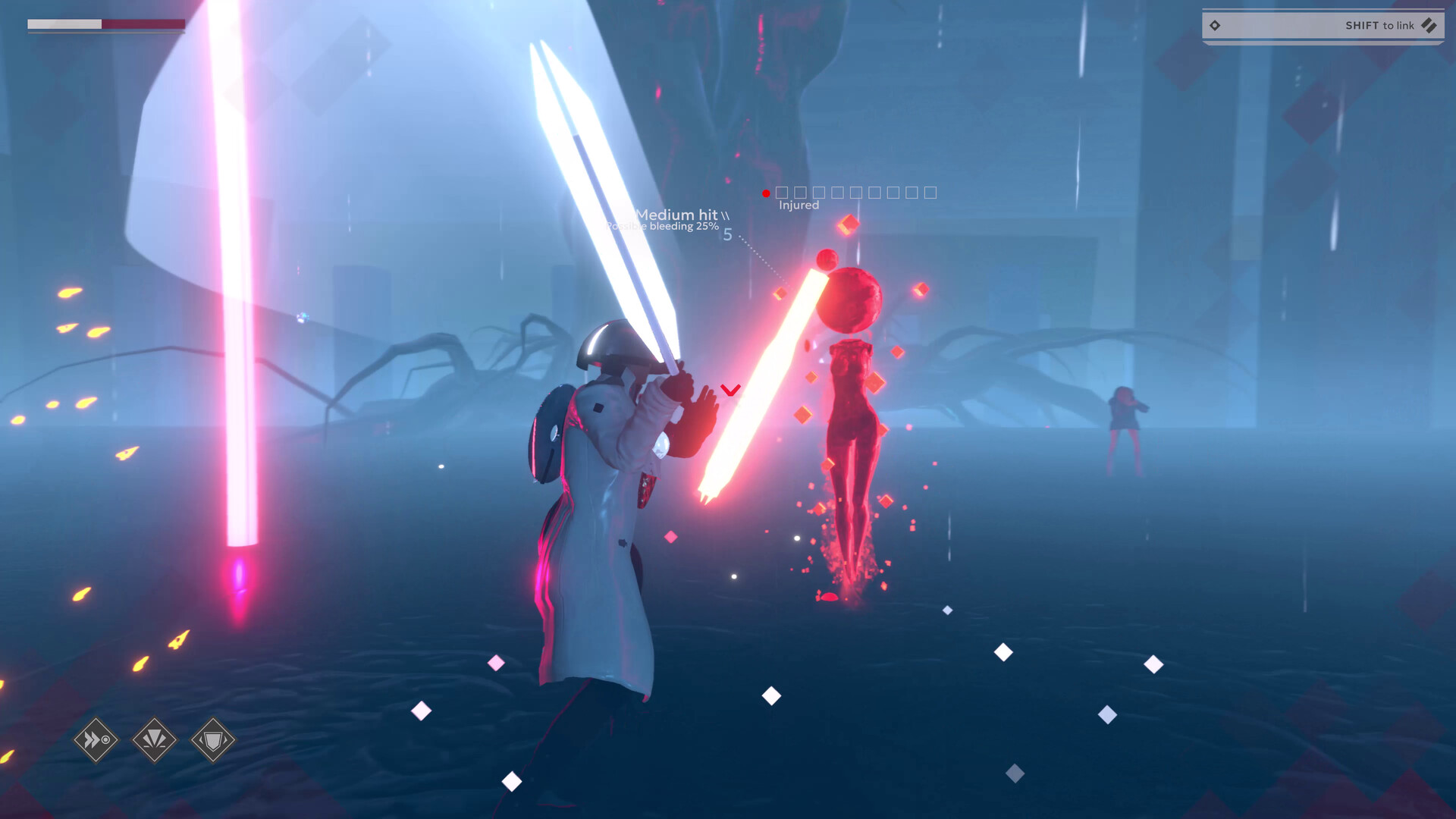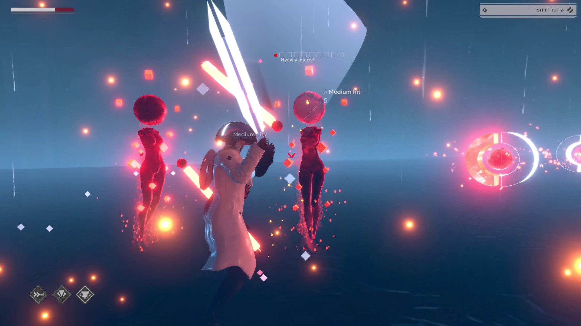 Foe pushed aside. Blade strikes. Rhythm of combat. Streak of red.