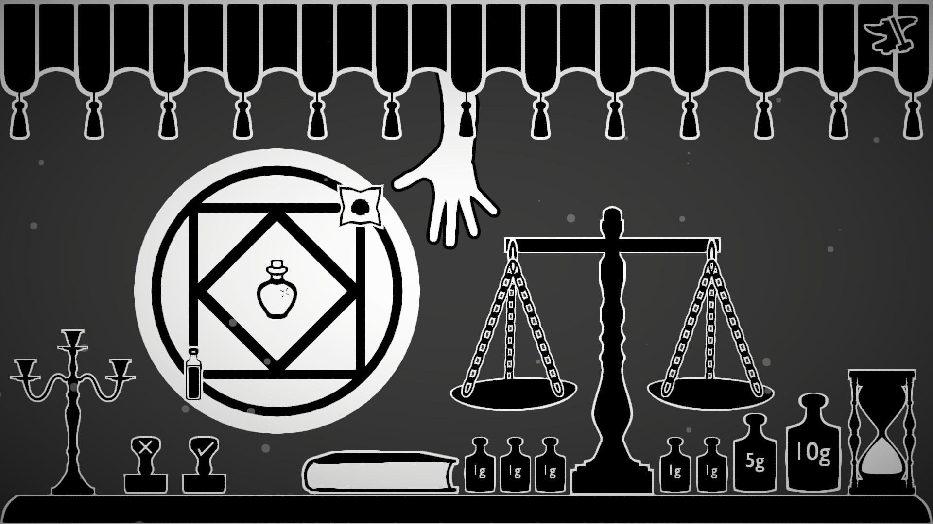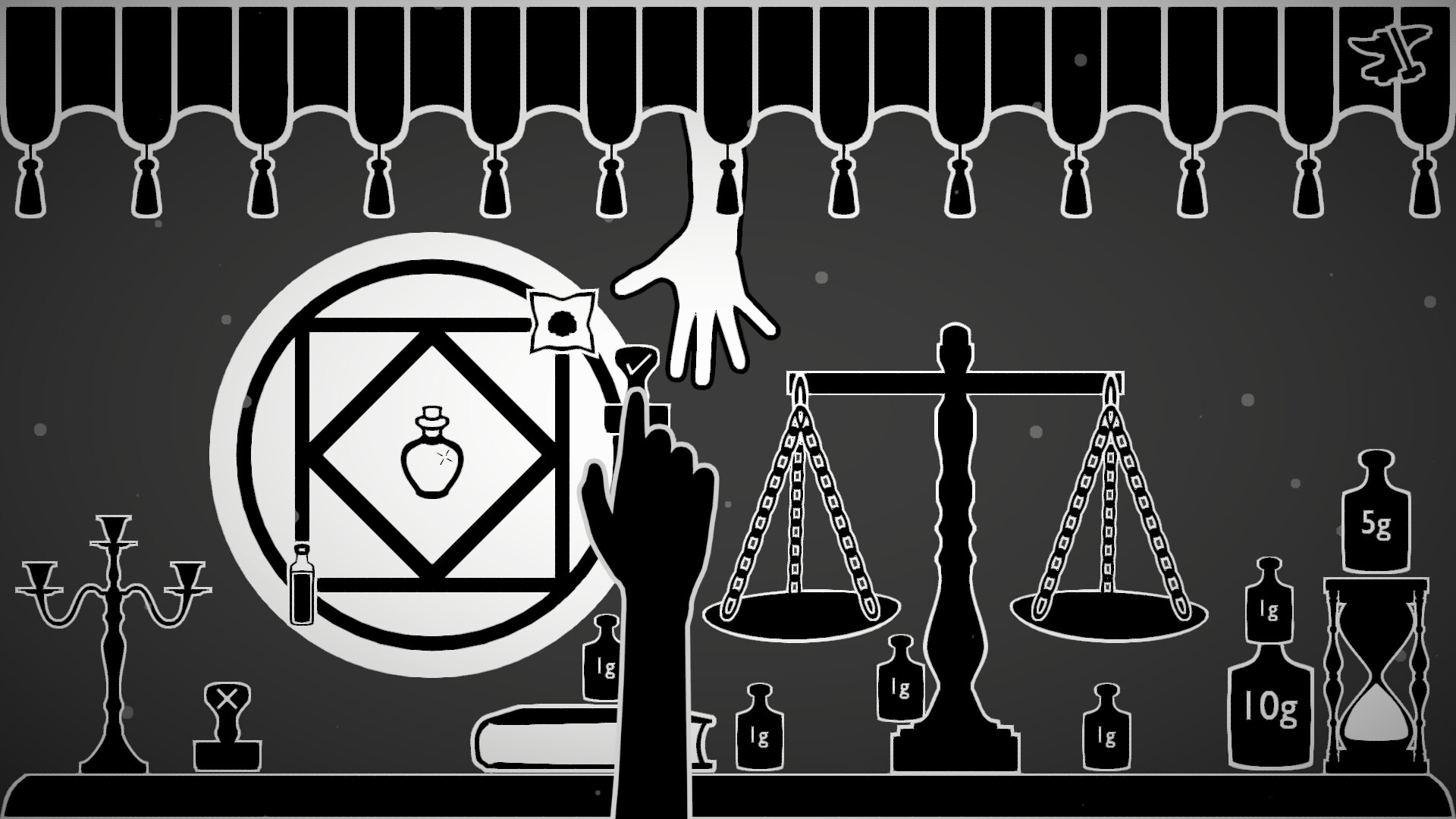 Behind the Curtain is a dark, atmospheric puzzle game where precision, logic, and quick thinking are the only means of escaping a fate worse than death. Under the watchful eye of an enigmatic Instructor, you must scrutinize alchemical recipes, verify ingredient weights, and ensure that every rule of alchemy is followed with exactness. If all is in order you may allow the alchemist Behind The Curtain to succeed. If they fail, you condemn them to the same fate you must now endure.