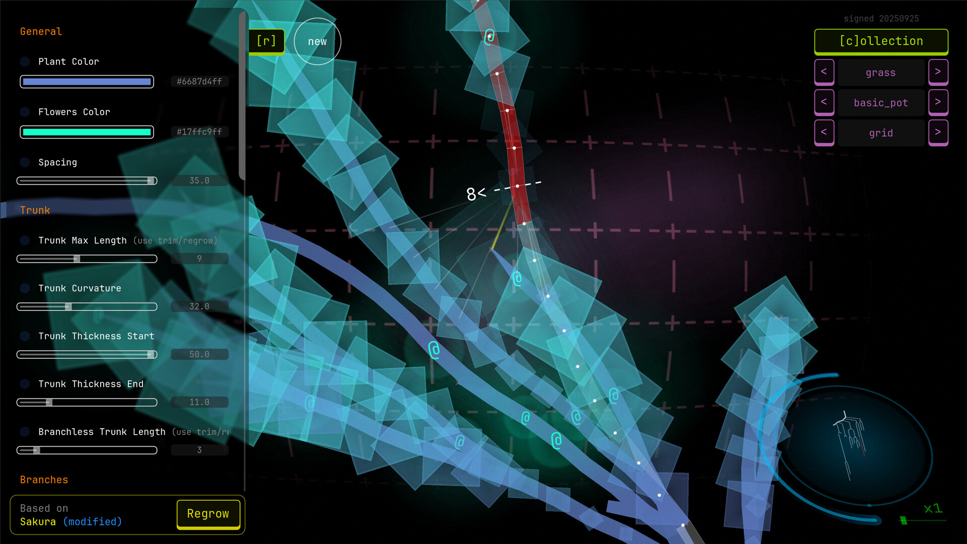 Each plant is generated from a unique recipe that can be customized through more than 20 parameters, including trunk length, branch thickness, foliage density, and color palettes. You can: