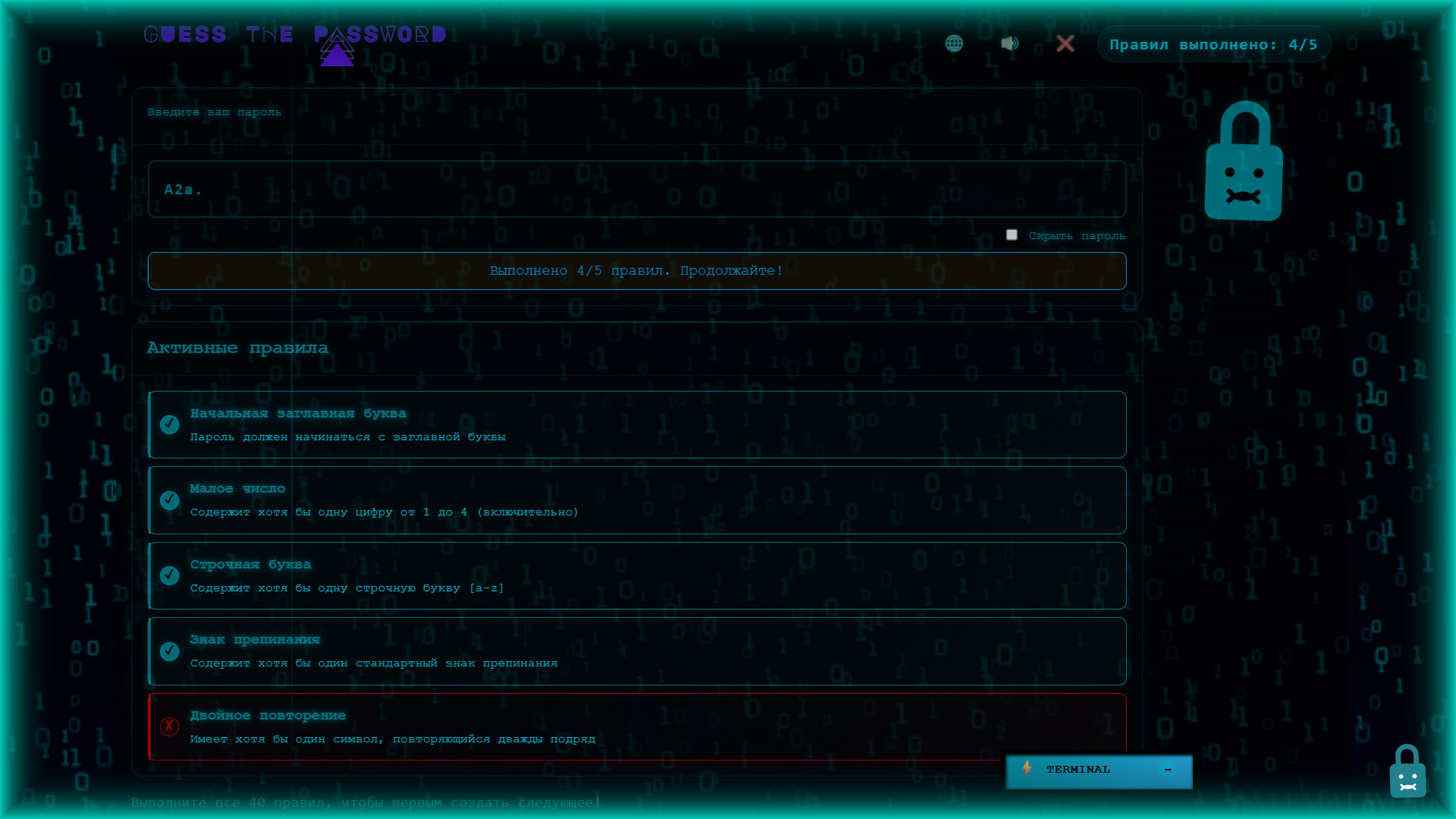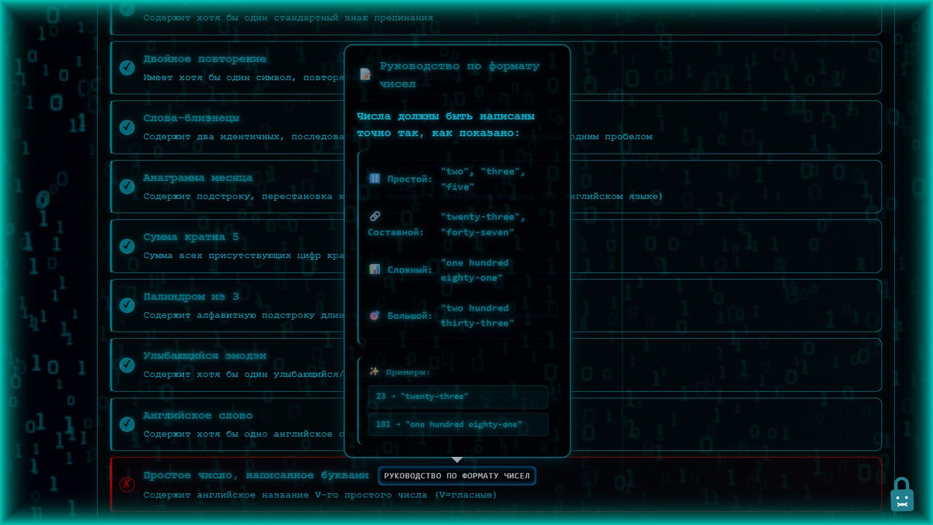 Решайте сложные текстовые головоломки с паролями на 40 уровнях, используя логику, рассуждения и дополнительные внешние инструменты. Добавляйте новые правила после прохождения всех уровней. Ваши правила, ваша игра: будьте первым, кто создаст её для других!
