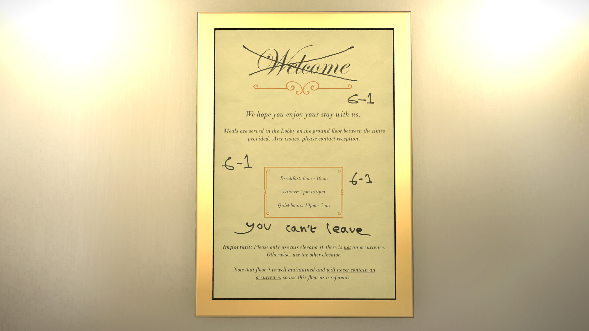 После смертельного происшествия вы оказываетесь в коридорах жуткого, лимінального отеля. Вы поднимаетесь на лифте, входите в почти идентичные коридоры и учитесь замечать то, чего не должно быть.