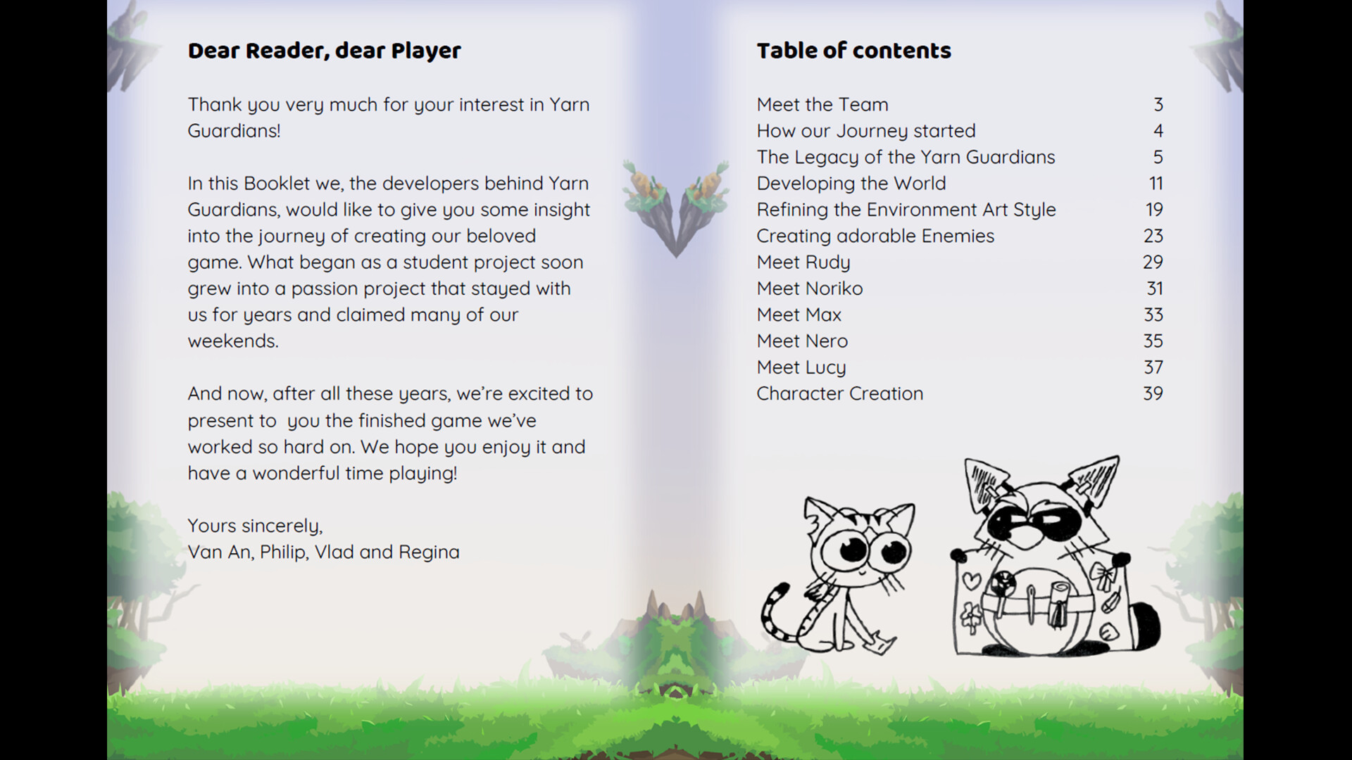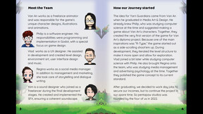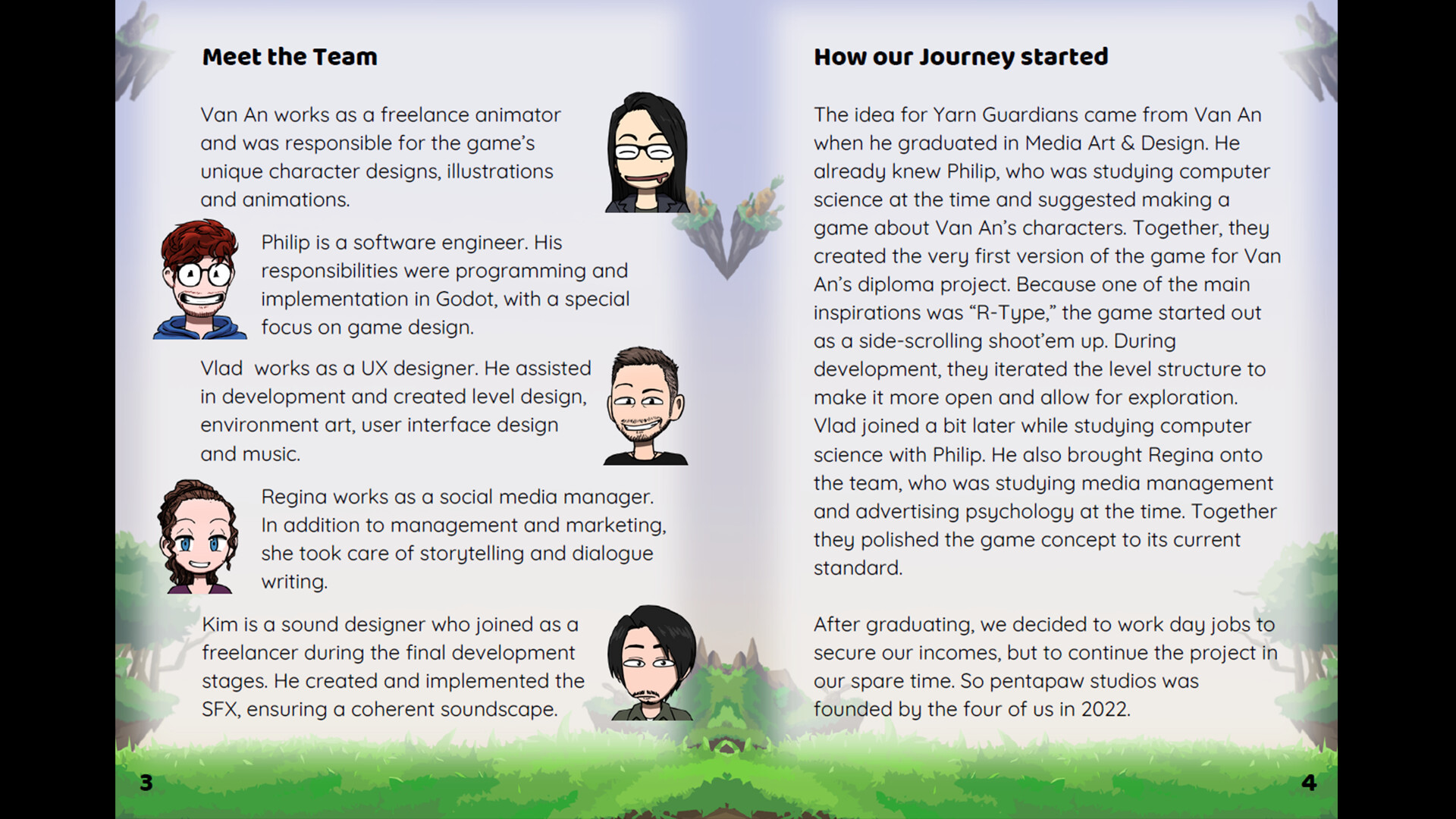 Meet the Team: Learn how Pentapaw Studios formed in 2022 and see the key contributors—Van An (animation & character design), Philip (programming & game design), Vlad (environment art & UX), Regina (story & dialogue), and Kim (sound design) Yarn Guardians Booklet.