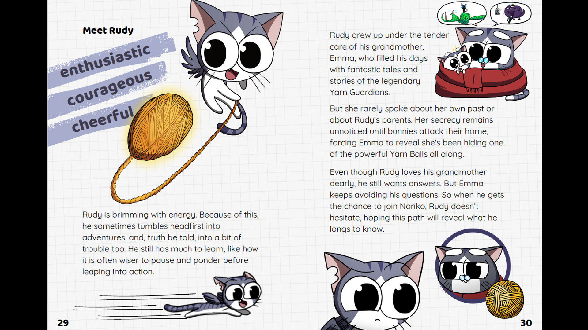 Character Profiles: Full-page spreads on Rudy, Noriko, Max, Nero, and Lucy—each with early sketches, personality notes, and evolution commentary Yarn Guardians Booklet.