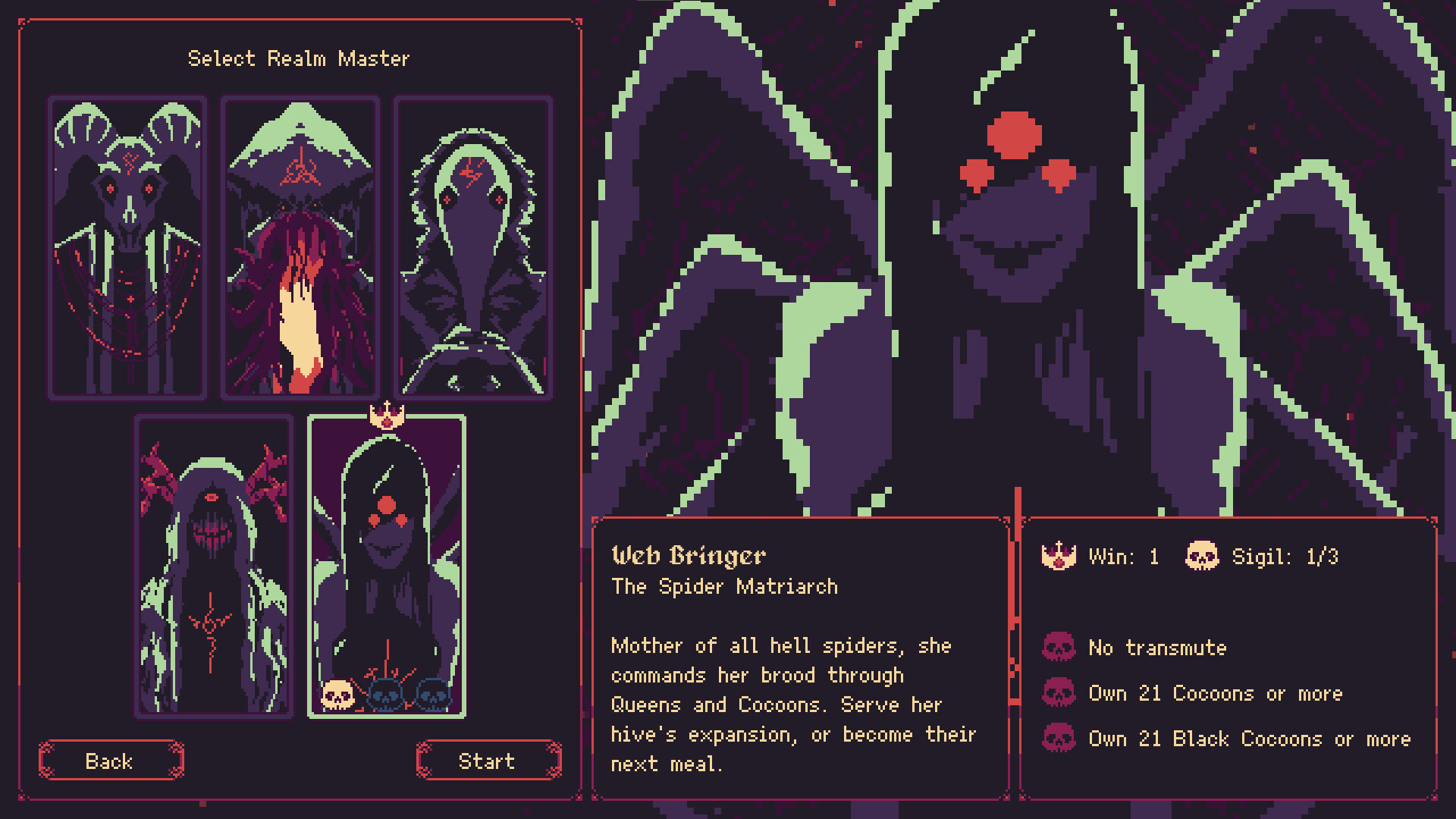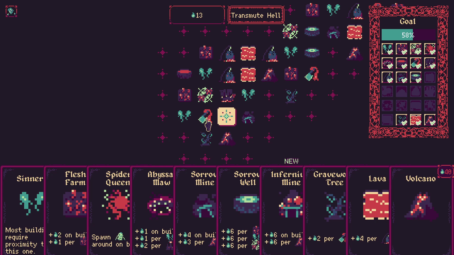 Каждое размещение здания имеет значение. Размещайте строения для создания мощных синергий, генерирующих Души - вашу основную валюту. Неправильное размещение приведет к нехватке ресурсов, в то время как мастерские цепочки синергий поддержат ваше адское строительство. Здания разблокируются динамически в зависимости от того, что их окружает: Королевы Пауков появляются только рядом с Паучьими Гнездами, создавая развивающуюся головоломку возможностей.