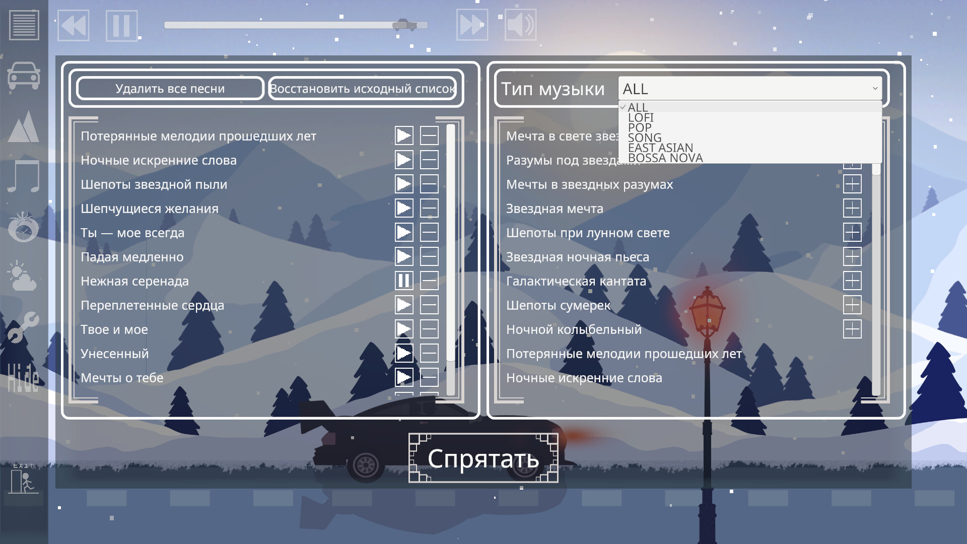 На старте полная версия будет содержать 69 музыкальных треков, разделенных на пять жанров (LO-FI, POP, SONG, EAST ASIAN, BOSSA NOVA). В DEMO-версии доступно 10 треков в трех жанрах (LO-FI, POP, SONG).