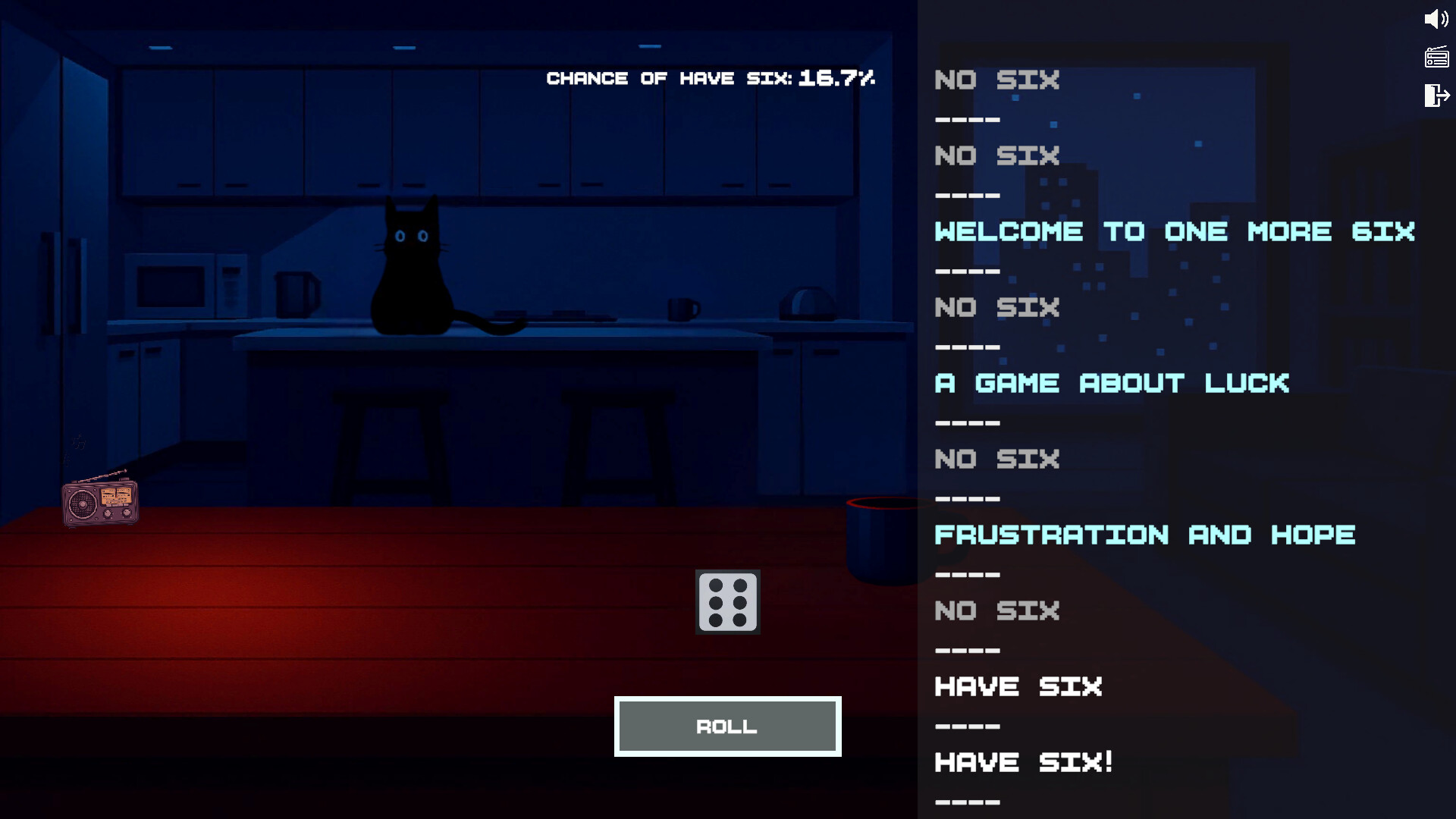 One More 6ix — это короткая минималистичная кликер-игра о бросках кубиков и погоне за почти невозможными сериями. Каждый бросок дает 1/6 (≈16,67%) шанса на шестёрку. Девять шестёрок подряд — это вероятность около 1/10 077 696.