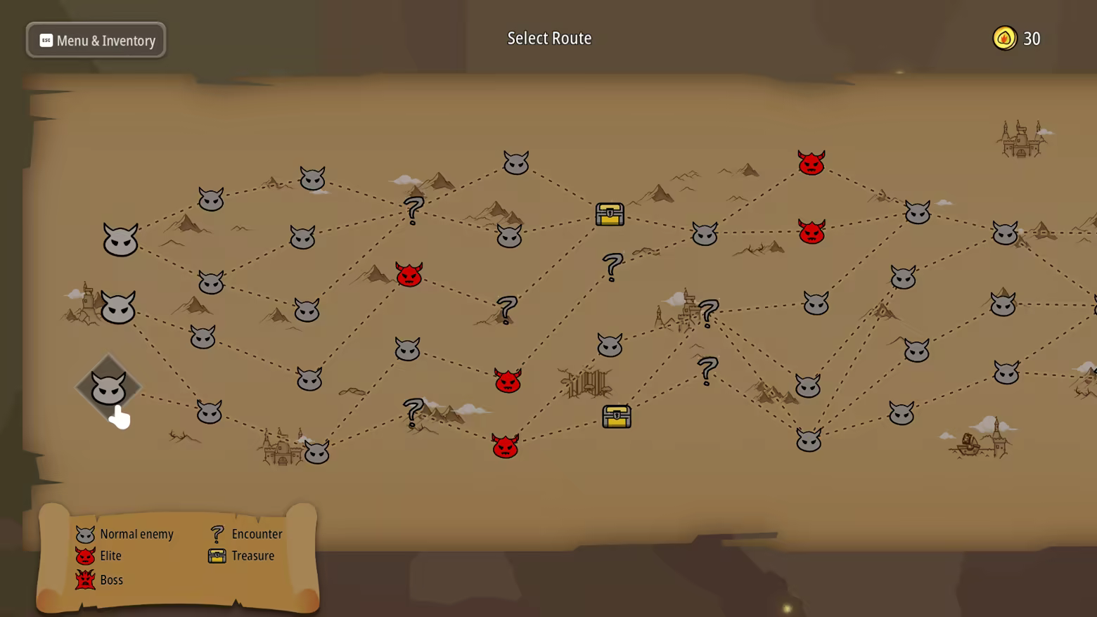 Для повышения стратегической глубины мы добавили механику Карты Маршрута. Вы можете выбирать пути, богатые Элитой, бросая вызов более высокой сложности ради лучшей экономики; или выбрать маршруты с большим количеством Случайных Событий и Сокровищ, снижая сложность боя, но полагаясь на удачу для получения ресурсов.