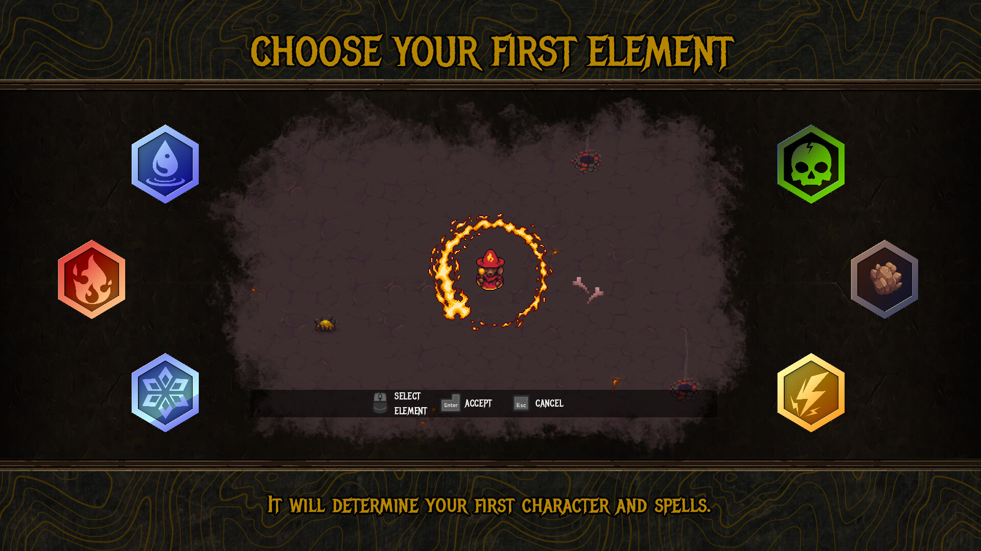 Выбери начальный элемент: огонь, воду, яд, электричество, землю или лёд — он определит твою траекторию. Остальные элементы станут доступны после разблокировки.