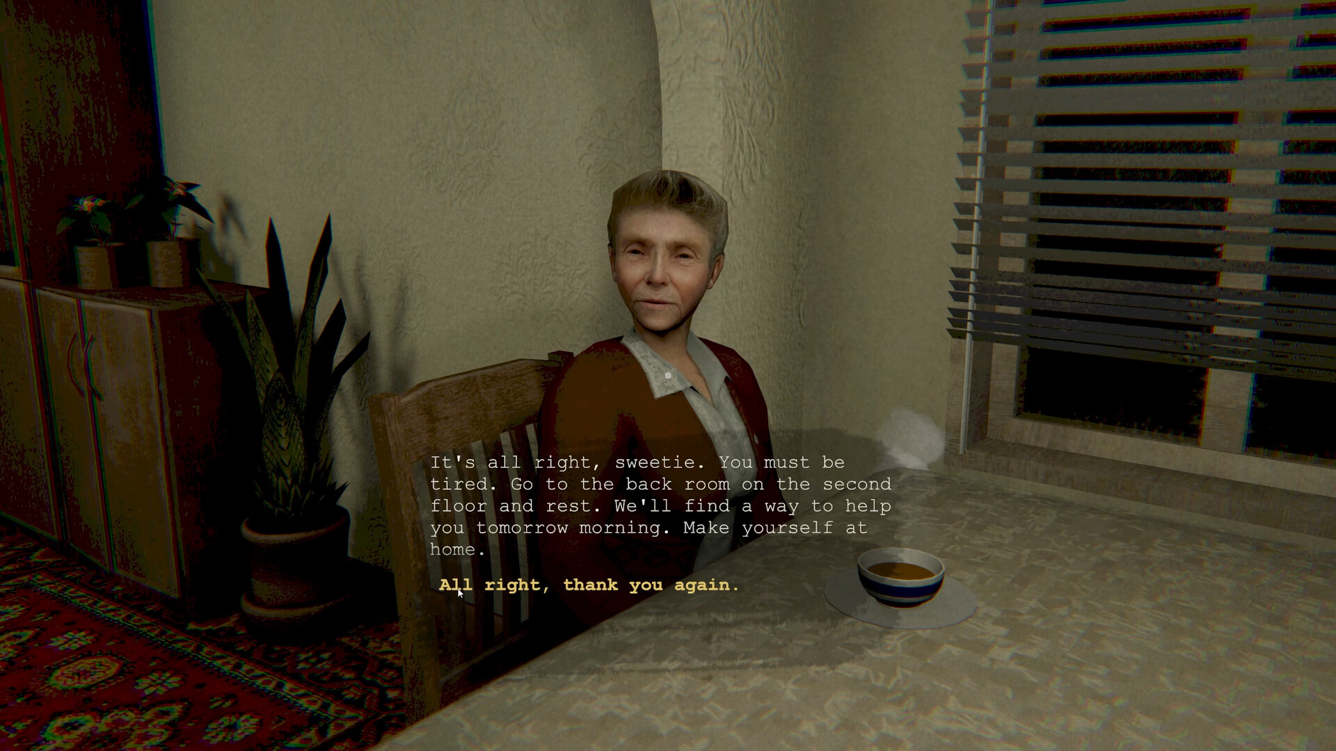 Очнувшись, она понимает, что связи нет, а буря только набирает силу. Единственный выход – искать помощь. Выйдя из машины, она углубляется в лес и вскоре находит старый дом. Доброжелательная пожилая женщина соглашается приютить её на ночь: отогревает, поит горячим чаем и предлагает комнату для отдыха.