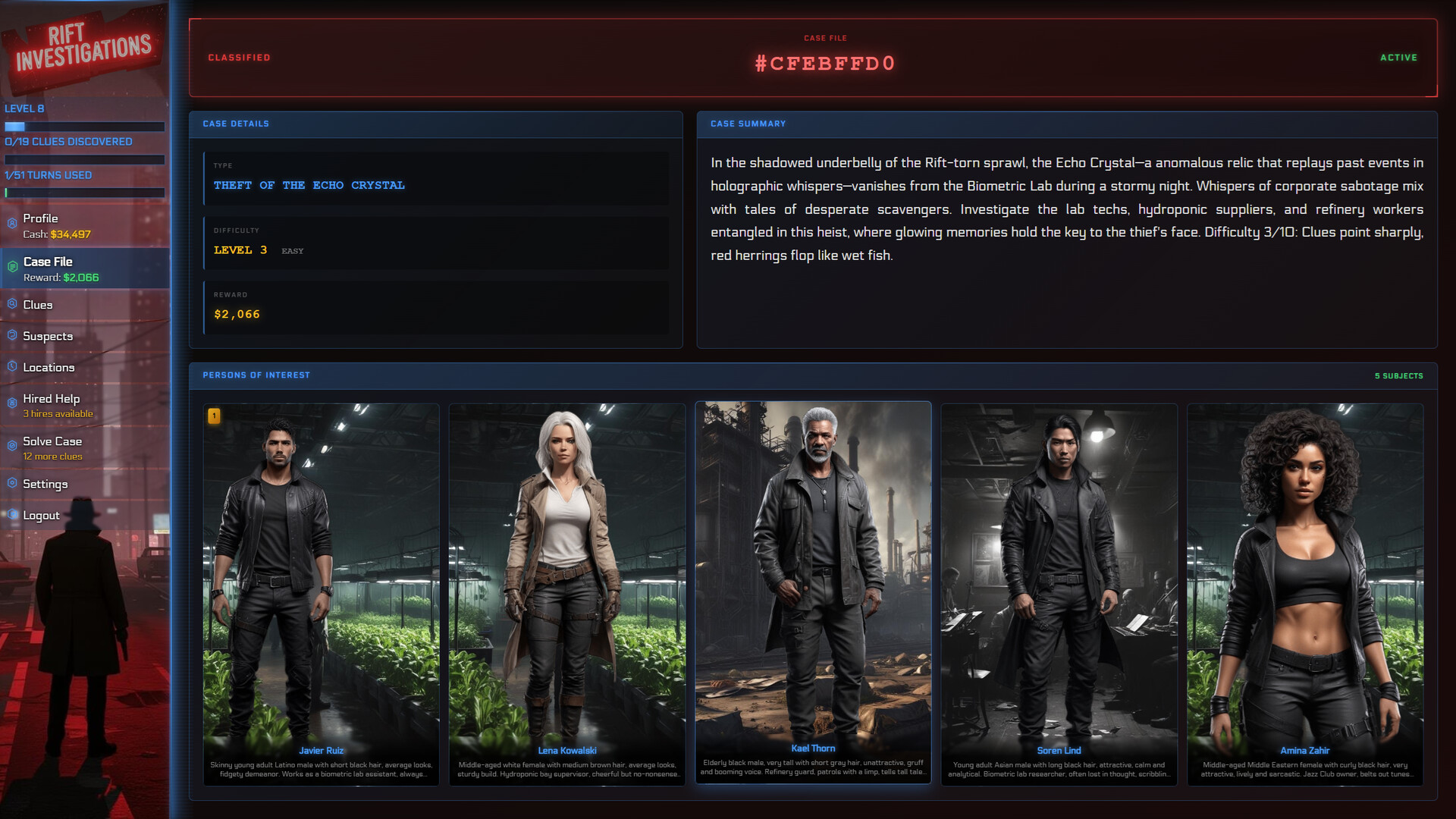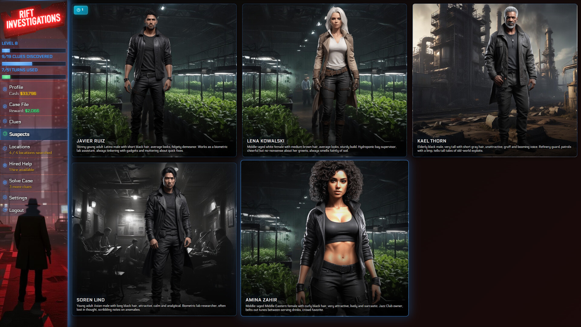 Работая на передовой ИИ, каждое расследование генерируется процедурно с уникальными подозреваемыми, уликами и выводами. Двух одинаковых тайн не бывает. От корпоративных заговоров в блестящих офисах руководства до необъяснимых исчезновений в аномальных зонах разломов—ваши дела охватывают весь спектр нуарной интриги с оттенком элдритчского ужаса.