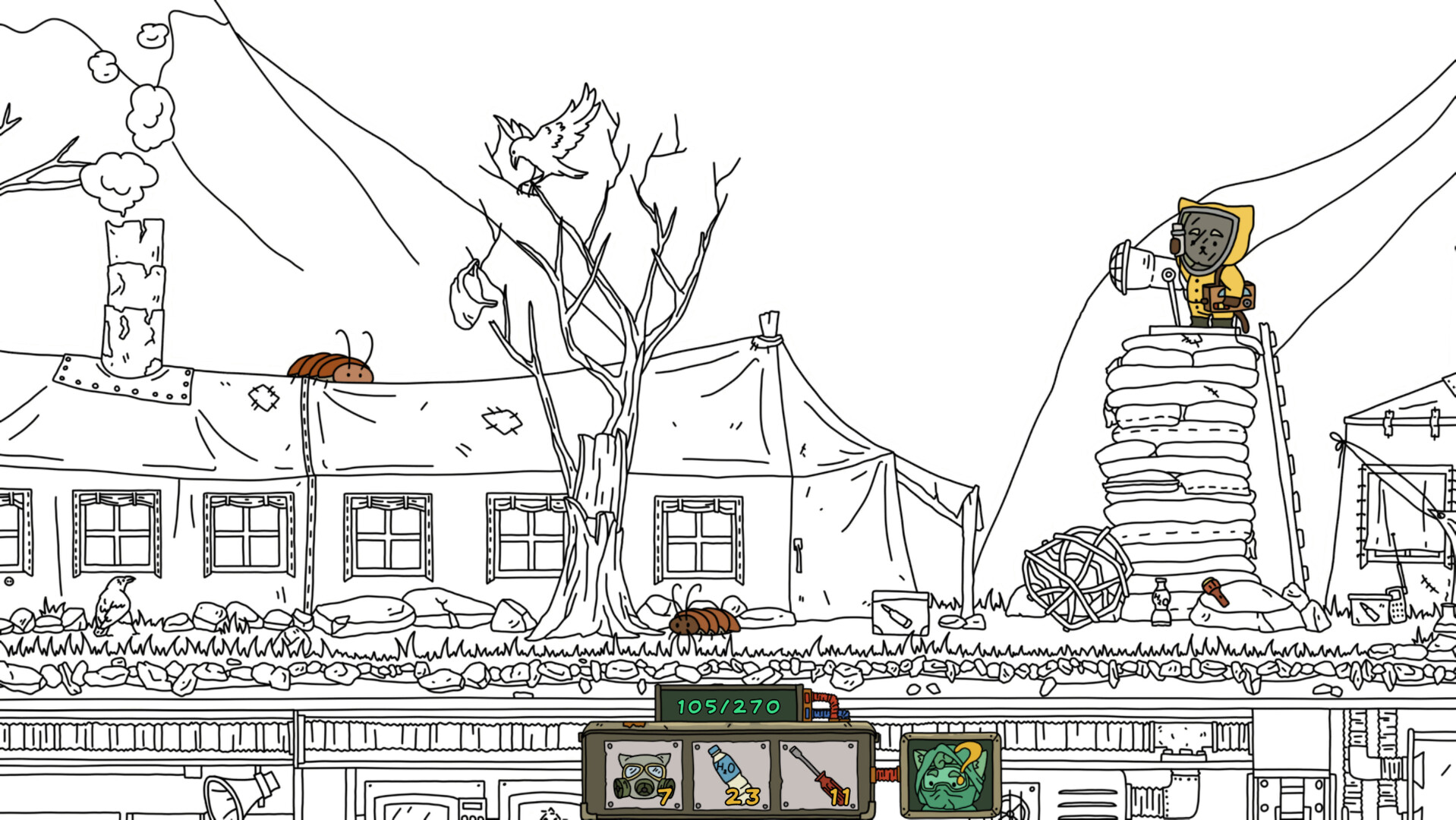 Исследуйте подземный бункер и то что осталось на поверхности земли после ядерного взрыва, находя 270 различных предметов и раскрашивайте черное белую картинку цветными красками