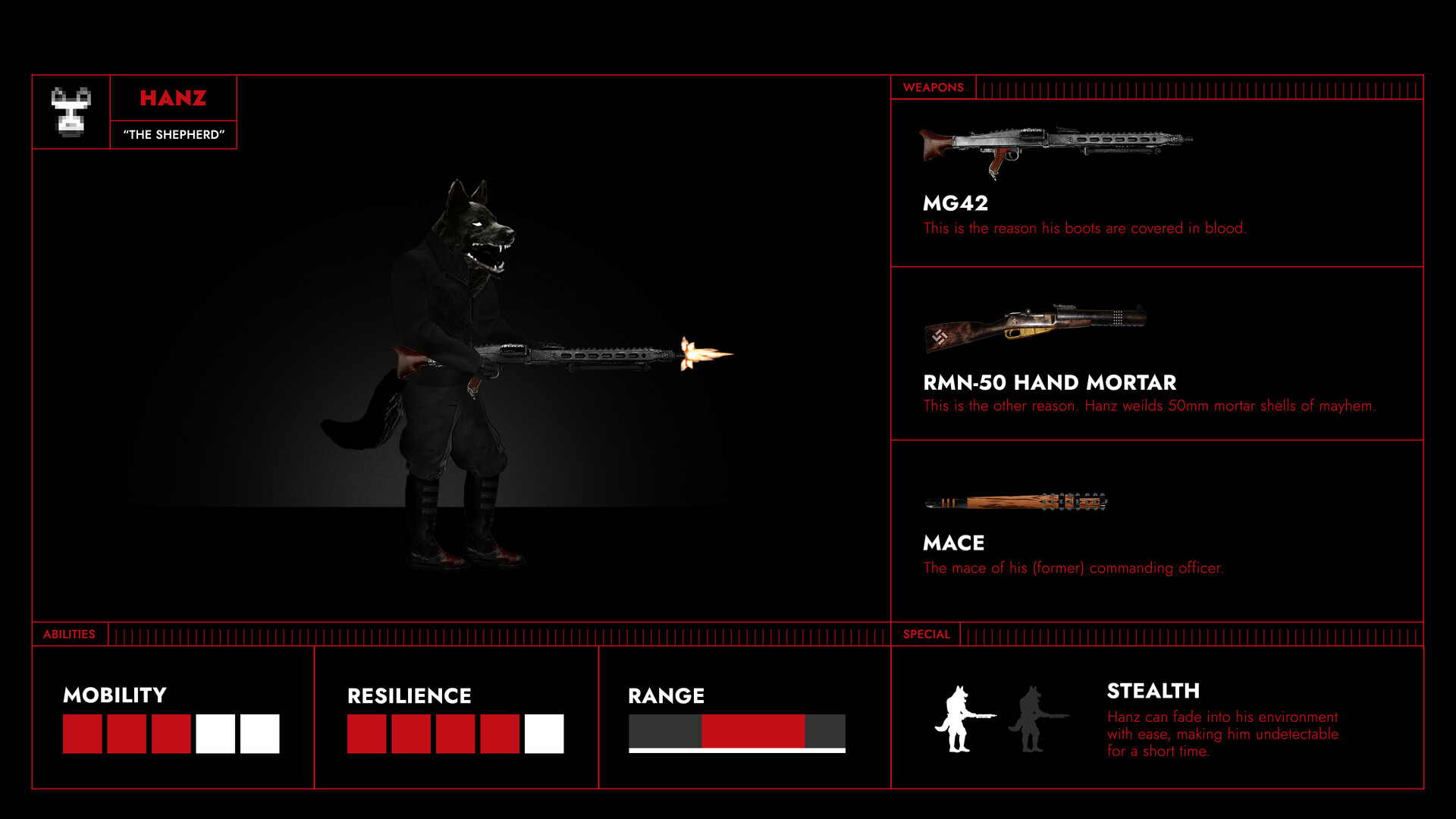 Overview: 1945—Hitler won the war by splicing animal DNA with human DNA: The Binary Super Soldier (half man, half german shepherd). They tore through the world's warriors like presents on Christmas morning. But, The Führer didn't stop there. He continued experimenting and created The Binary Elite. You are the chosen one, the very first Binary Elite Super Soldier, designed to usher his reign to the end of time. But will you? HELL no. In campaign mode "The Awakening" you'll learn who you are and what The Führer has planned for you. You'll fight your way through obstacles and plenty of Binary Super Soldiers. As you fight your way to freedom, you will learn of the other 3 Binary Elite: Grizz (The Bear), Carol ("The Stork"), and Hanz ("The Shepherd"). In DEFIANCE MODE, which is an infinite-round horde survivor game mode, you can choose to play as any of the 4 Binary Elite (Harey, Carol, Grizz, or Hanz). Each character has their own unique abilities, weapons, and special ability. You can also play DEFIANCE MODE with up to 3 friends, each choosing your own character.