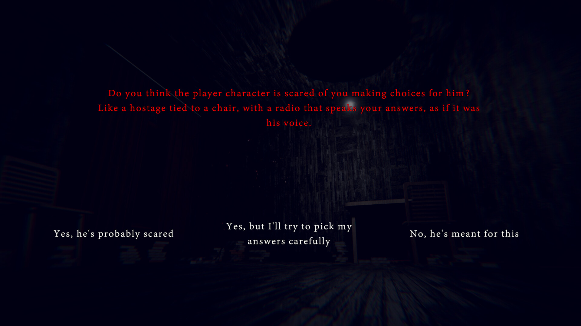 Timore Narhelma is a surreal experience about human mind and horrors within. The text on the screen is asking you various questions, that all have a connection to your being, yet they don't seem similar on their own. You get to experience a fraction of your mind being tested, and you get to choose your answers. Probably.
