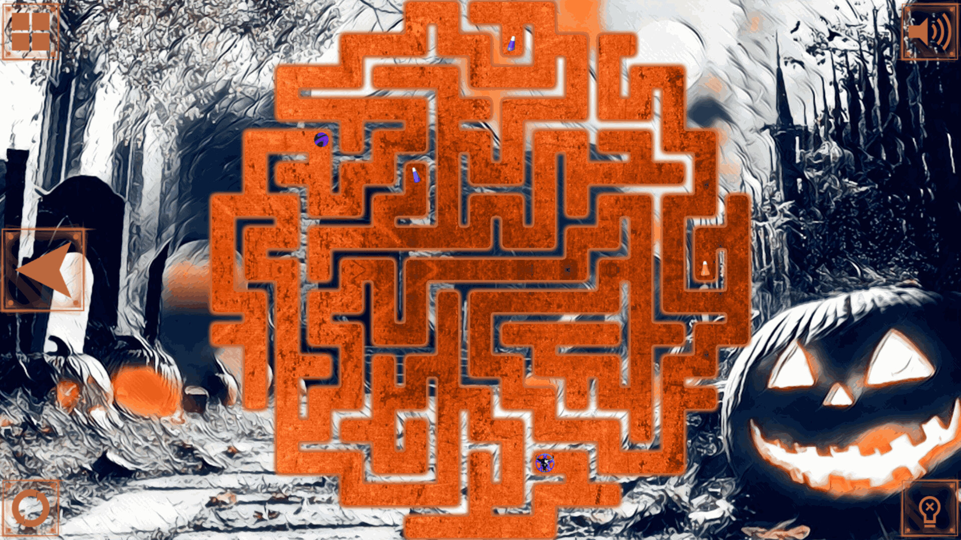 In this game, you need to skillfully move the puzzle pieces, find their corresponding places, and seamlessly connect the colorful parts of the maze to complete it. Afterward, guide a small ball through the maze, collecting candy corn to unlock the portal to the next level, typically located at the opposite end of the maze.