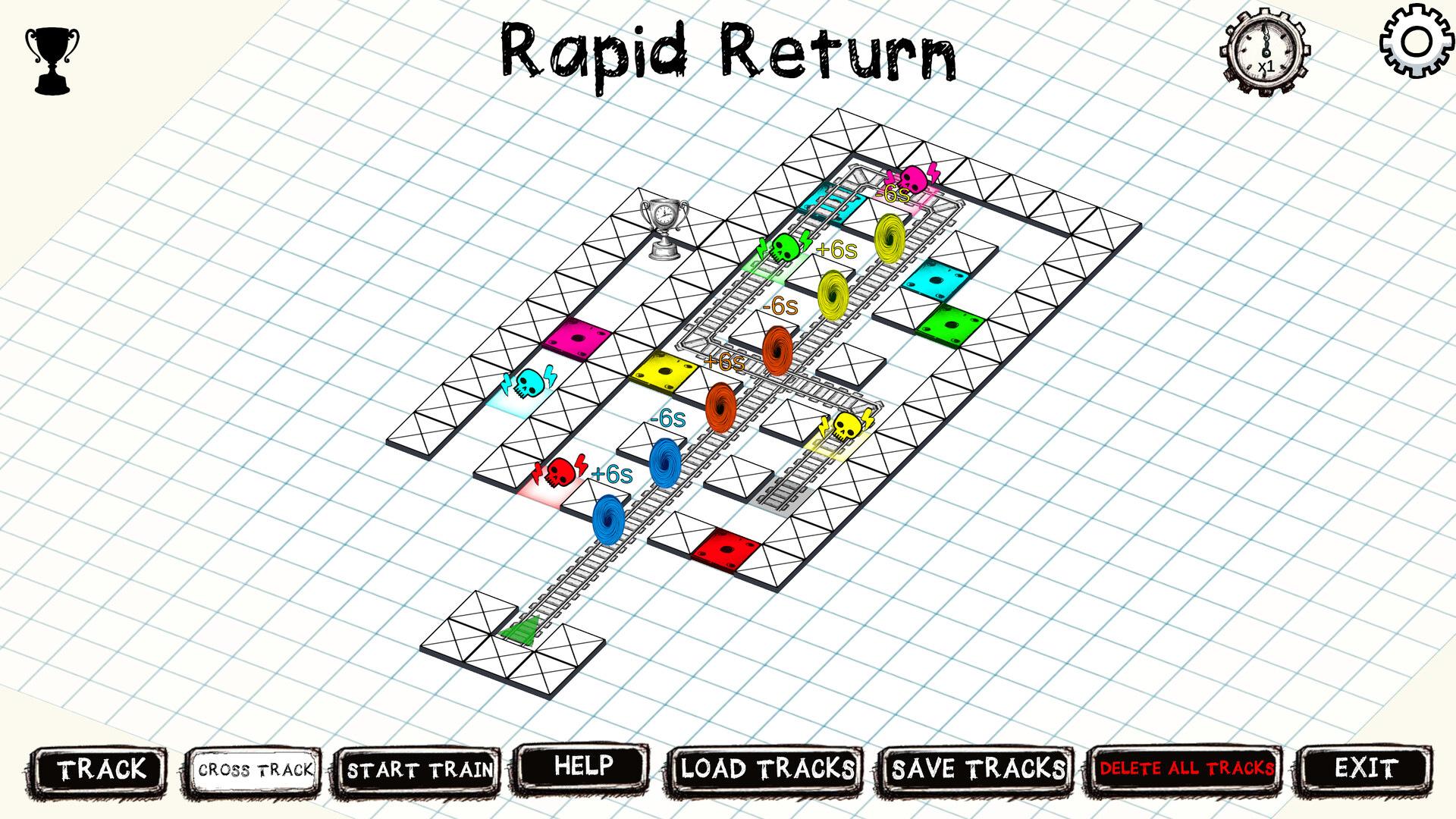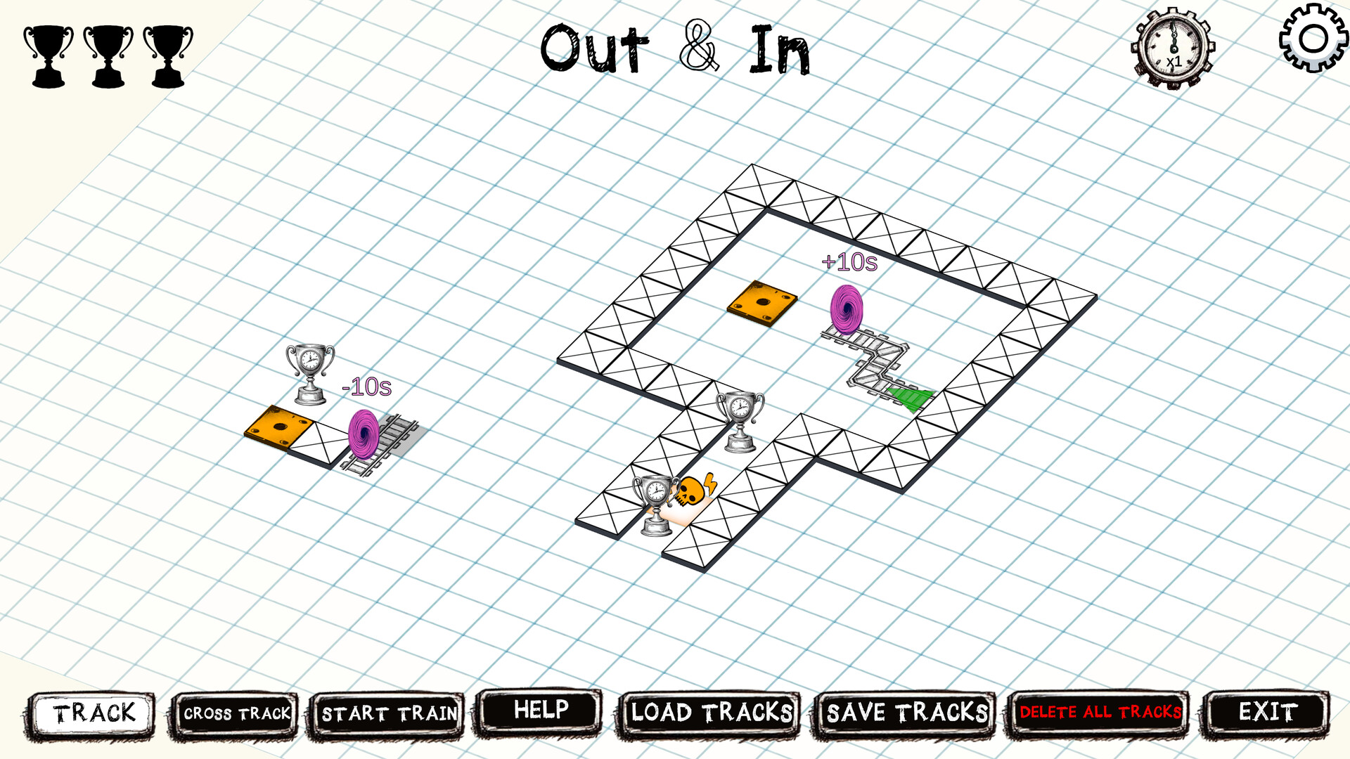 Число над каждым порталом показывает, насколько далеко поезд переместится в прошлое или будущее. Чтобы пройти уровень, постройте путь, который позволит TimeTrain собрать все трофеи на игровом поле. Однако будьте осторожны — смертельные ловушки могут уничтожить поезд, если их не отключить в нужный момент... А этот момент может быть как в прошлом, так и в будущем!