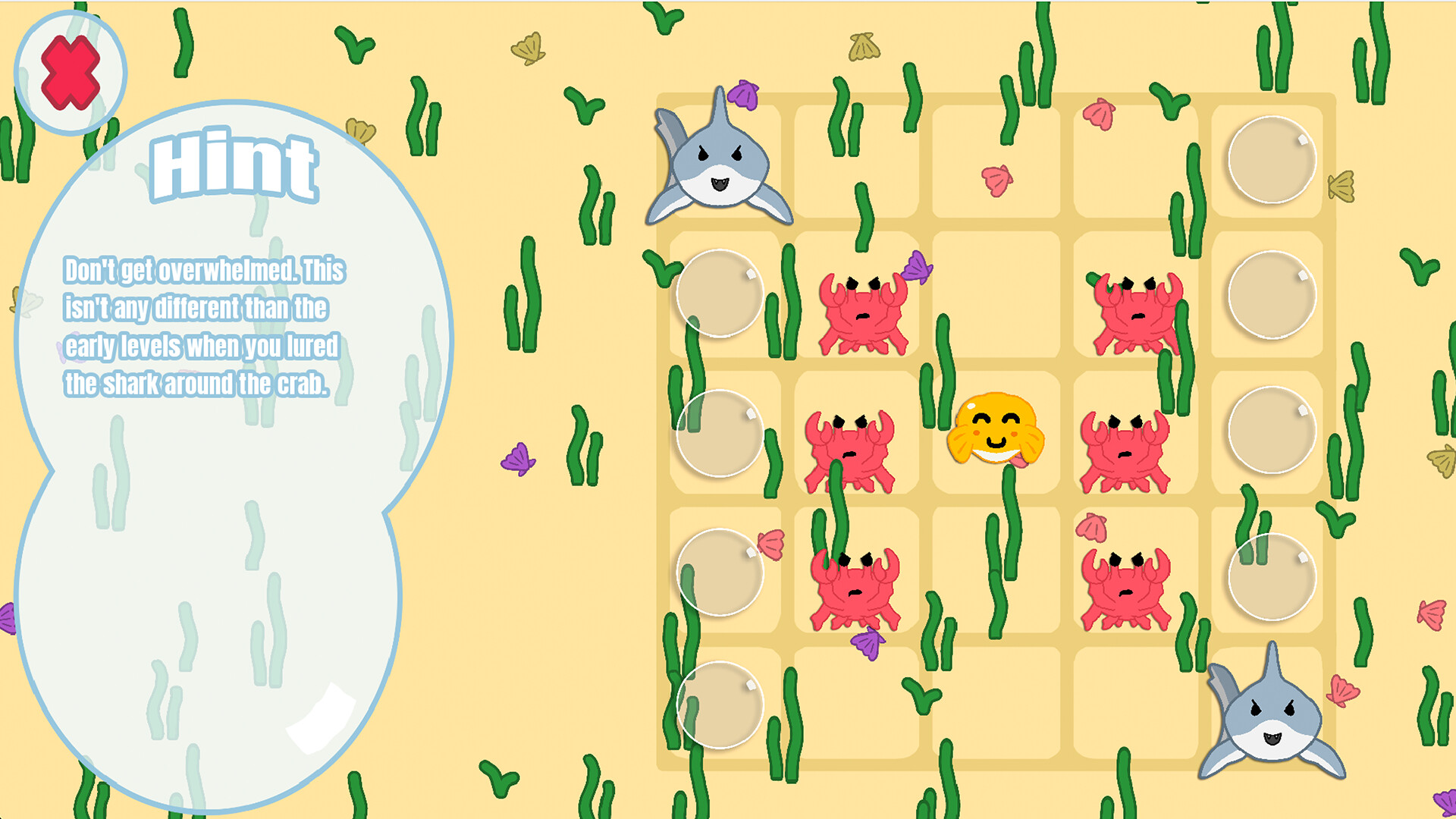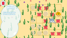In the puzzle game Puffer Pop, you leverage your environment to dodge sharks, eat crabs, and rearrange bubbles. To survive the sharks, you'll need to puff up and show your spikes. However, there is a catch—you need air bubbles to do that... and a bubble only inflates a single side...