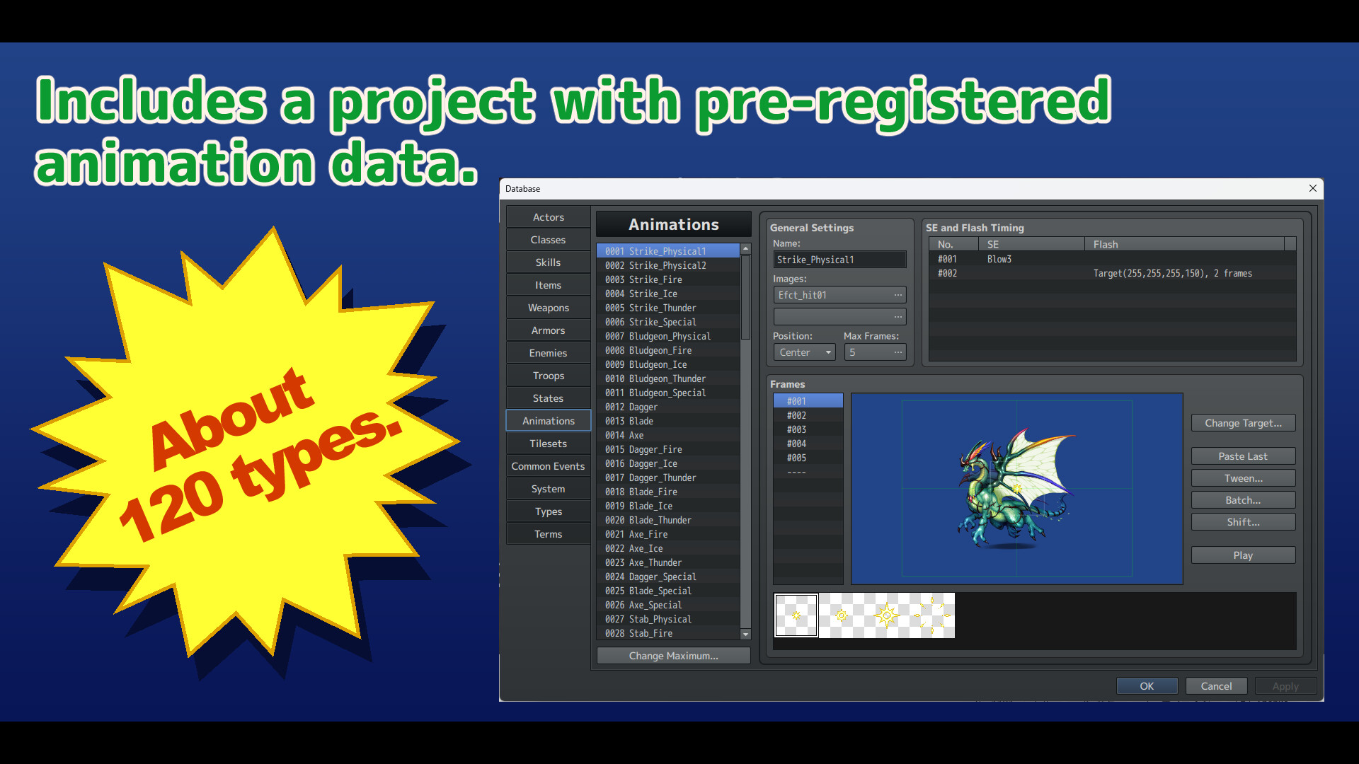 It includes a large number of sprite sheets, along with a project file containing approximately 120 pre-made animation data sets created using those sheets.