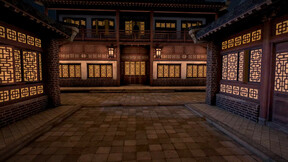 A narrow streetside area lit by lanterns, windows and the moon. Features breakable doors that allow you to enter side buildings.