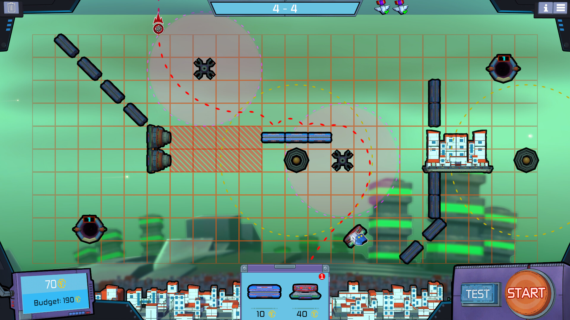 Do you think you can find a more efficient solution? Do not fret. You can iterate between different designs really fast. You can add, destroy, or move your defense buildings endlessly and without cost. And if your head is not on the game at the moment, your solution will be saved, so you can always come back later and tinker with it again.