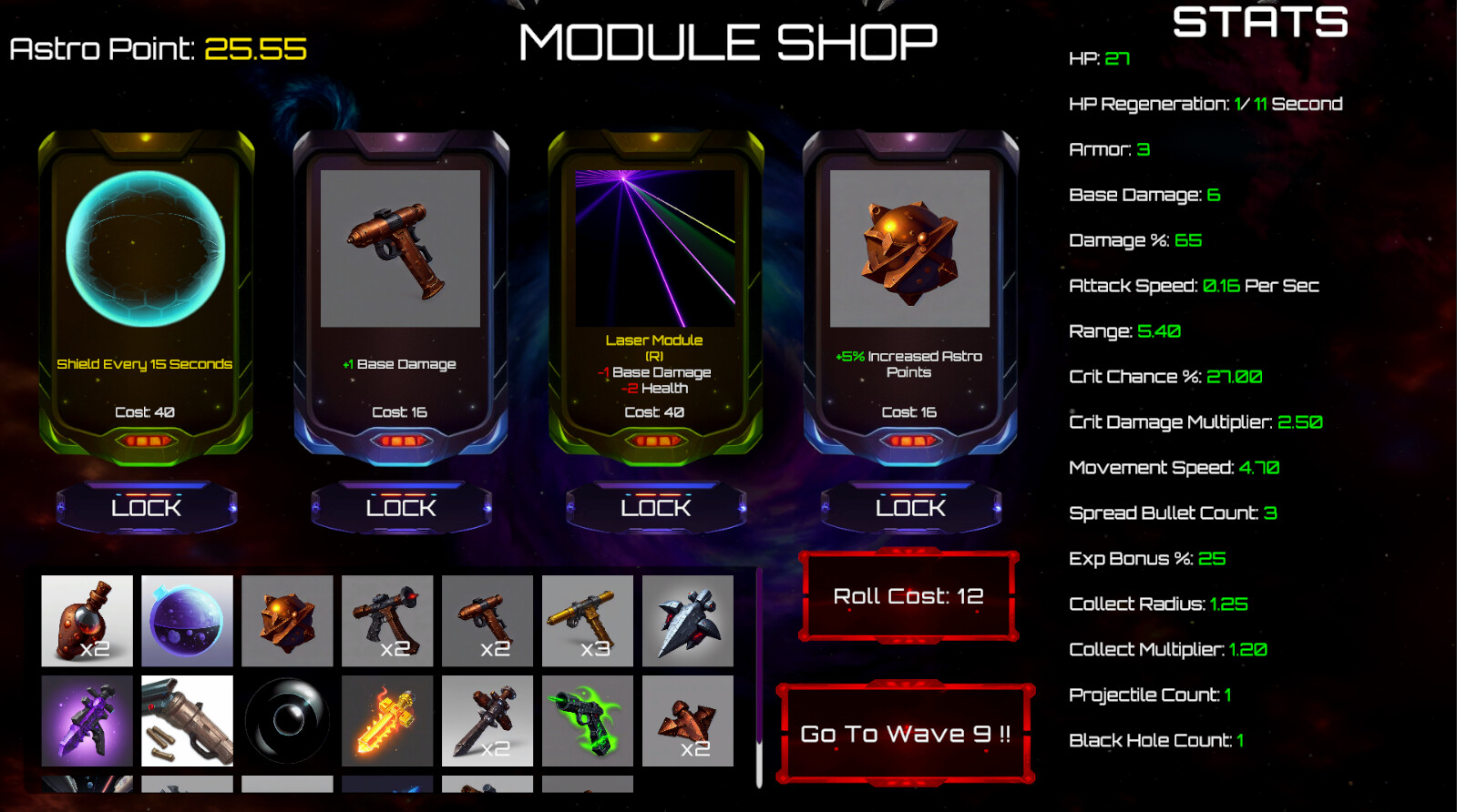 В классическом режиме игры вам придется выживать против врагов в течение 20 волн. После 20-й волны решение о продолжении игры остается за вами. По завершении 20-й волны открываются новые корабли и следующий уровень. В конце каждой волны вам предоставляется четыре варианта улучшений, позволяющих усовершенствовать ваш корабль, выбрав тот, который вам больше нравится. С помощью постоянных баллов, которые вы зарабатываете, вы можете формировать свой стиль игры, внедряя постоянные улучшения в главном меню. Геймплей достаточно прост: управление кораблем осуществляется с помощью клавиш "wasd", а корабль автоматически стреляет в ближайшую цель.