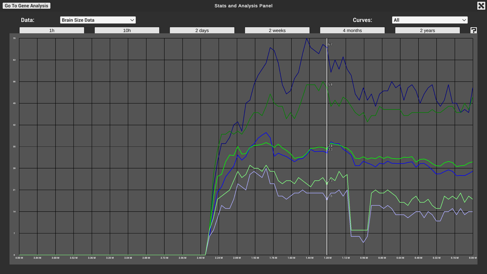 Unlock the secrets hidden within your worlds with various in-game tools. Follow your Bibite's ancestral journey with family trees and lineage views, or, analyze the population's stats and genetic information over time.