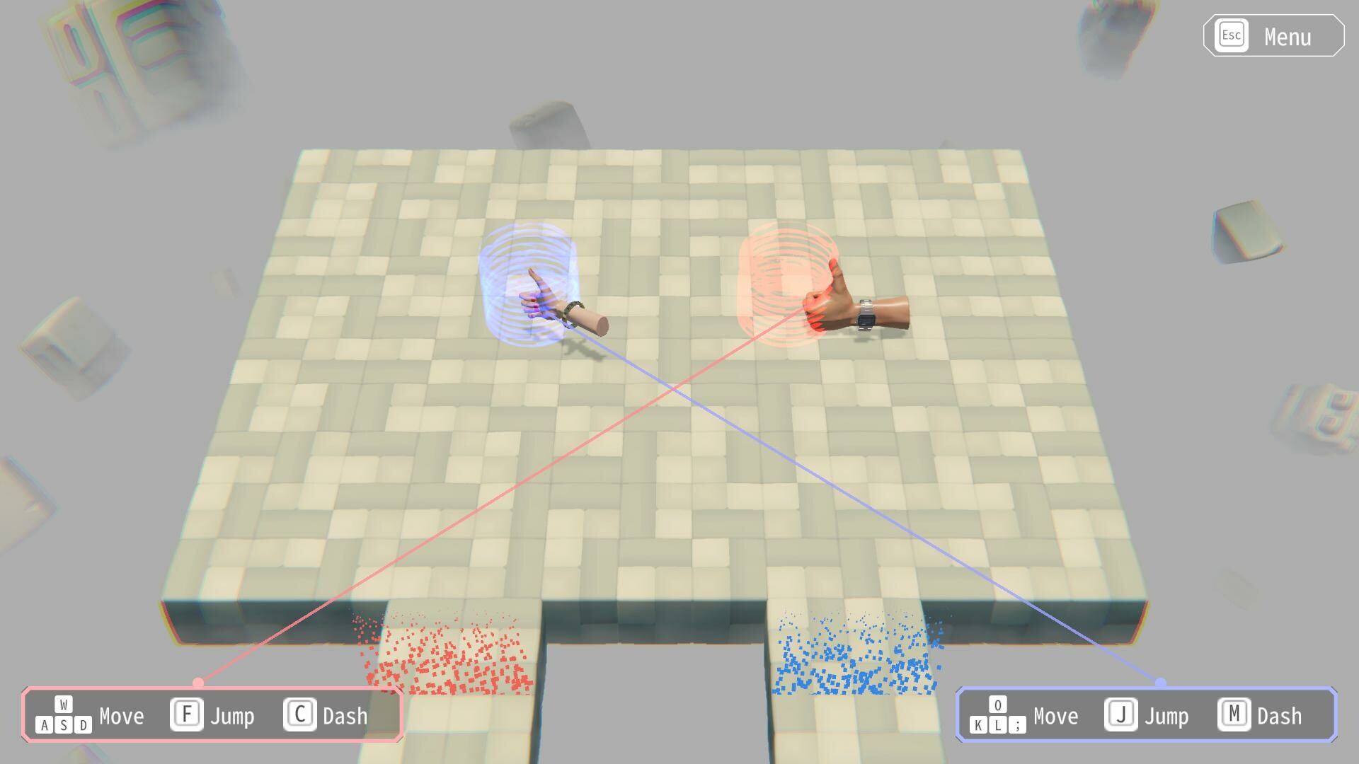 While the game is primitive, controlling two characters independently with separate hands may cause significant stress to participants. Please do not continue the experiment if you find it too stressful, and take breaks as needed.