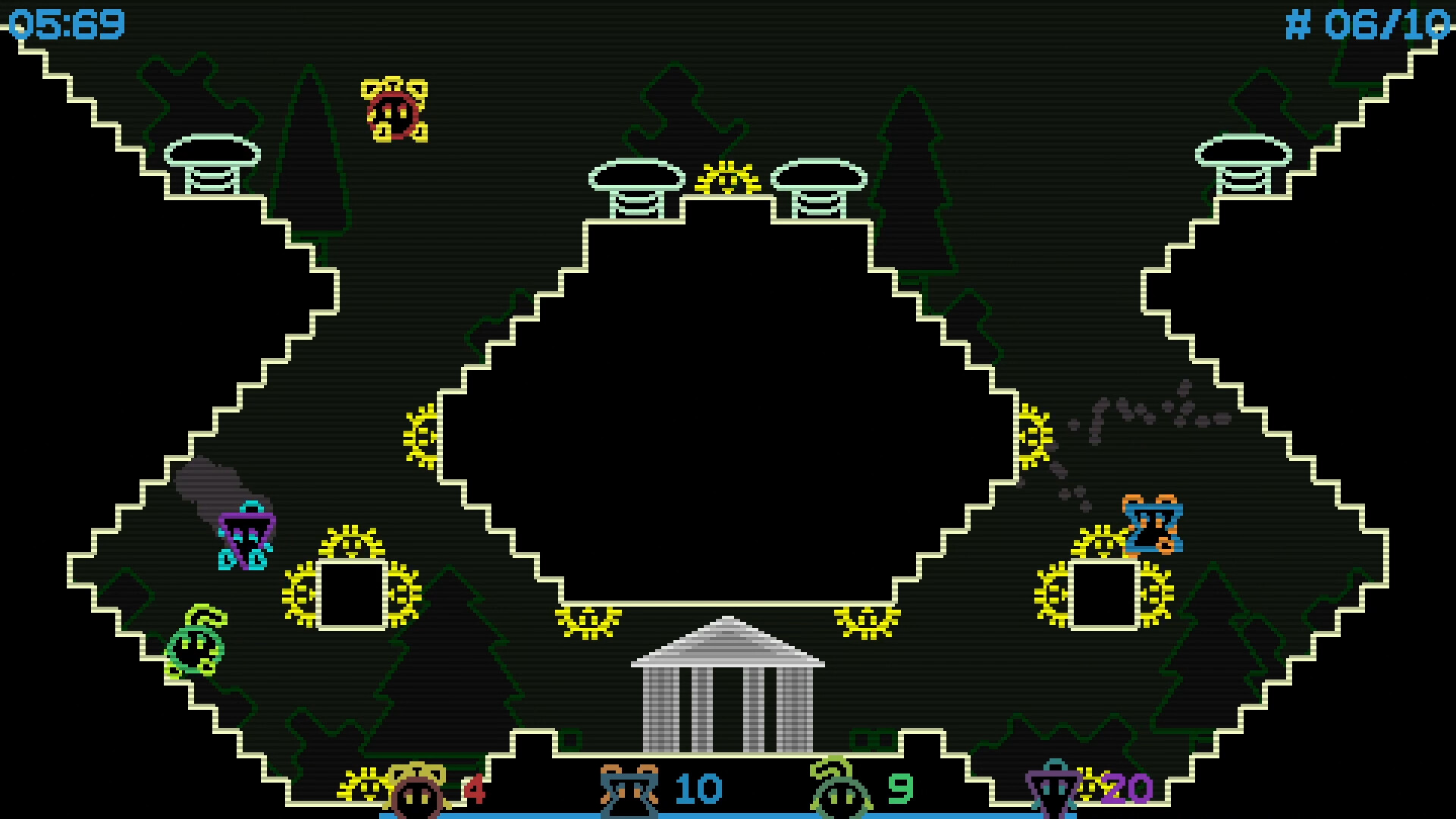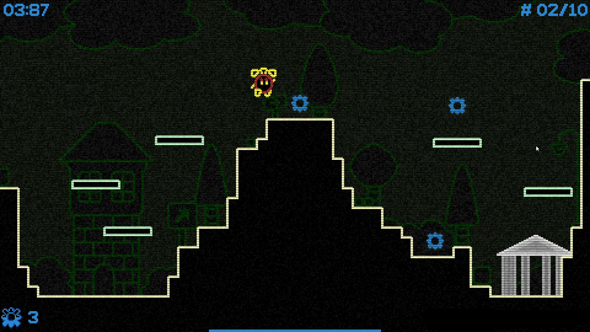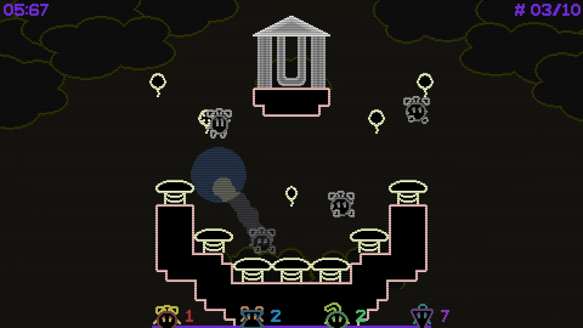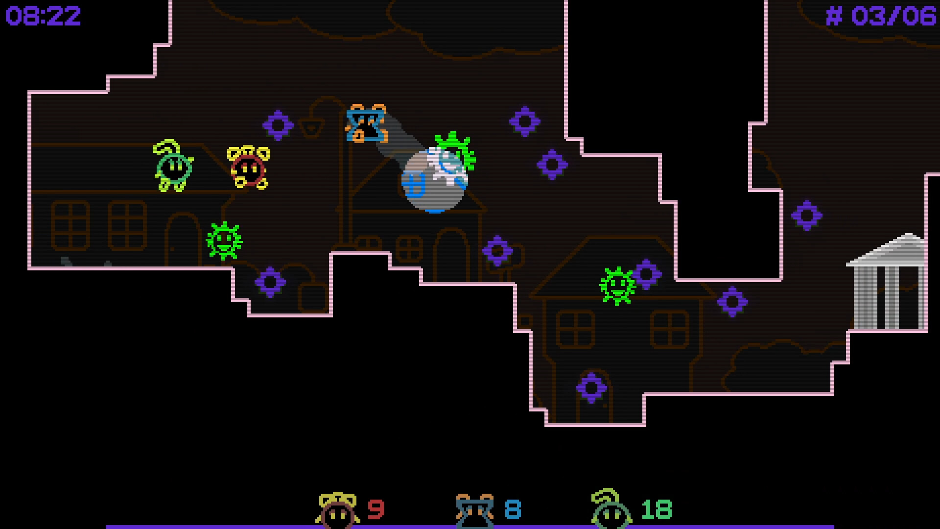 No friends at home today ? Hone your platforming skills in single-player modes. Arcade mode features a selection of randomly-chosen stages, with leaderboards and 5 difficulty settings to unlock. Collect gears to improve your character’s abilities roguelike-style, and try to clear 6, 10, 16 or even ∞ stages before the timer runs out!
