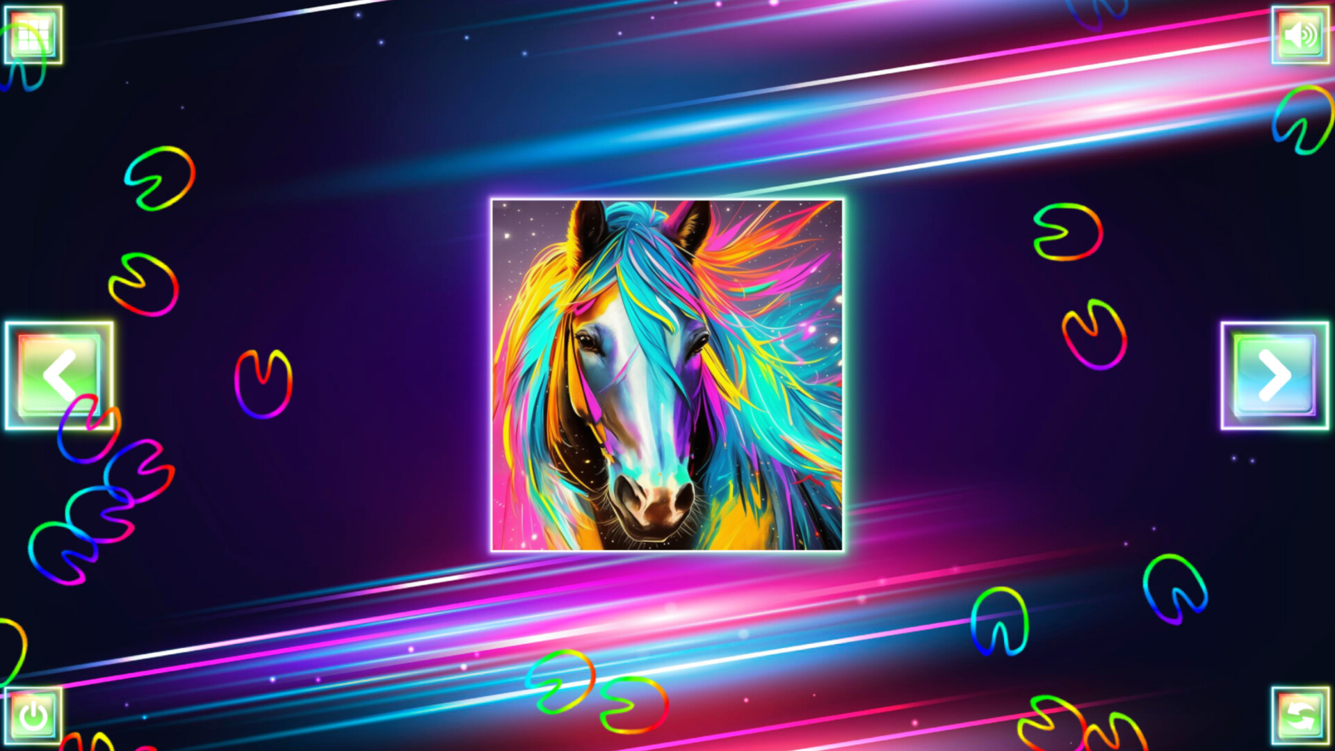 The game features several levels of difficulty, allowing you to choose the optimal level for your experience and mood. Regardless of the difficulty, you can enjoy high-quality images of horses in bright neon style.