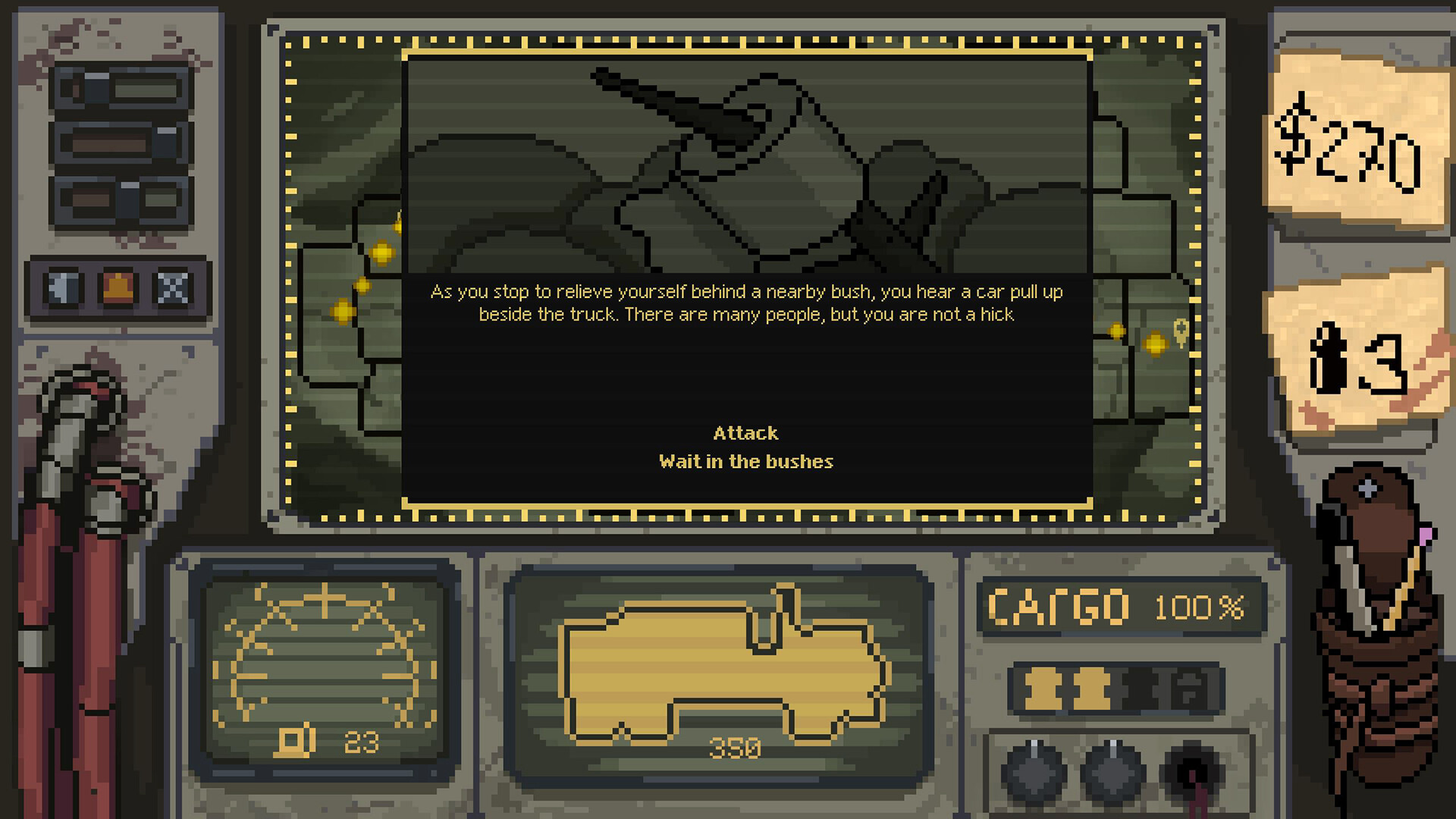 Игра представляет собой интересный проект, который подойдёт для того, чтобы скоротать в нём скучный вечер. На прохождение может уйти от получаса до пары часов, в зависимости от стиля игры. Несмотря на небольшой объём контента (примерно 70–75% можно увидеть за один заход), игра оставляет специфические впечатления. Рассмотрим её сильные и слабые стороны подробнее. Плюсы: - Оригинальная идея: Концепт курьера в постапокалиптическом мире выглядит свежо и нестандартно. (С DS это можно не сравнивать, т.к. у отца геймдева кардинально отличается видение всемирного звиздеца) - Основные механики: Хорошо реализованные базовые элементы игрового процесса. - Разнообразие событий: Есть некоторая вариативность в разворачивании ситуаций по мере игры. - Юмор и отсылки: Множество гэгов и мемов добавляют игре шарма и поддерживают интерес (пример с "проигрышем стекла заднего вида в блэкджек" выделяется особенно). - Вариативность автомобилей: Для прохождения доступны автомобили с разными характеристиками, что добавляет выбор игроку. Минусы: - Зависимость от случайности: Рандом сильно влияет на игровой опыт. От карты региона до дорожных событий — везде роль удачи слишком велика. - Несбалансированность сложности: Отсутствует градация уровней. Например, начальные регионы могут вынуждать переигрывать несколько раз из-за нехватки ресурсов, тогда как финальные могут быть пройдены без особых сложностей. - Скудный интерактив: Интерактивных элементов очень мало. Весь процесс сводится к трем основным типам действий — погрузка/разгрузка товара, заправка и случайные события. Даже с добавлением случайных ситуаций этого недостаточно, чтобы удерживать интерес на долгий срок. - Прокачка автомобилей: Этот аспект кажется не до конца продуманным. У машин заметны различия только в перках, которые не всегда полезны. Например, один автомобиль обладает сканером событий, другой умением "прыжка" через карту — но эти функции недостаточно эффективны на фоне необходимости постоянной прокачки топливного бака, что становится основным фокусом игры. Итог: Игра имеет перспективы, но нуждается в доработке. Если разработчики будут регулярно добавлять контент и улучшать механику, проект может стать хорошей визитной карточкой. На данный момент это скоротечный опыт, после которого не остаётся желания возвращаться. Тем не менее, за первый опыт разработчику можно простить многие недочёты. Лично я решил поддержать ребят, несмотря на столь короткое время прохождения. Удачи в дальнейшем и успехов в развитии игры!