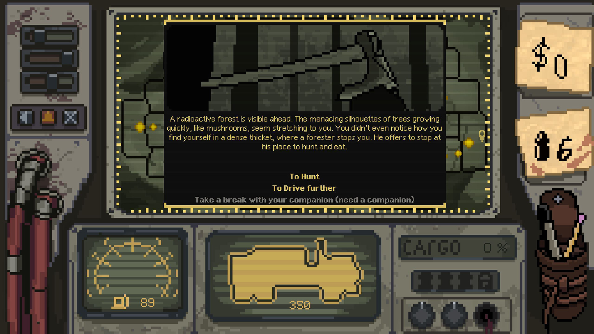 A text-based game with resource management elements set in a post-apocalyptic world. Your task is to plan a route and deliver cargo safely, all while participating in unique events with various outcomes.