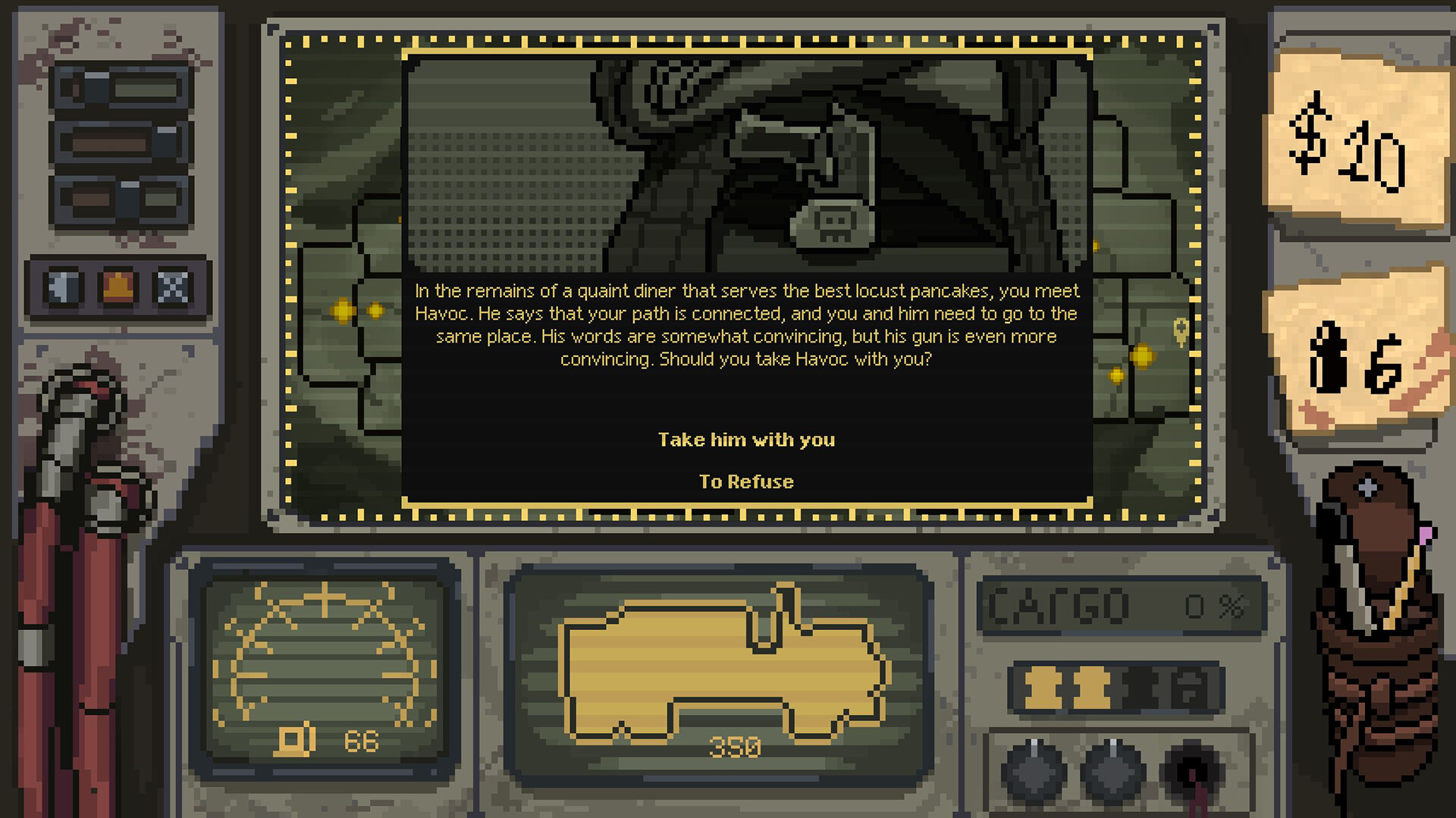 Несмотря на простоту задумки - вот точка А, вот точка Б, посередине события с вариантами развития, игра берет свой стилистикой и музыкой. Смесь дикого запада и постапака - это на любителя, но я как раз один из них. Да, можно было написать что-то в духе: события повторяются, общий сюжет прост как пять копеек и так далее, но какой смысл, когда это отладочный проект, чтобы понять свои силы (как мне кажется)? Приятная игра на один вечер, без багов, сценарист - не кринжовый КВНщик, какая-никакая вариативность, но немного задушила постоянная нехватка топлива, даже когда заезжаешь на бензоколонку.