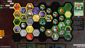 Each turn you can move your mage to an adjacent hex and take control of it. The color of each hex signifies which type of mana it produces, and you can use the mana of controlled hexes to pay for cards in hand. All your hexes replenish at the beginning of each turn so you'll be able to afford more expensive cards as the game progresses.