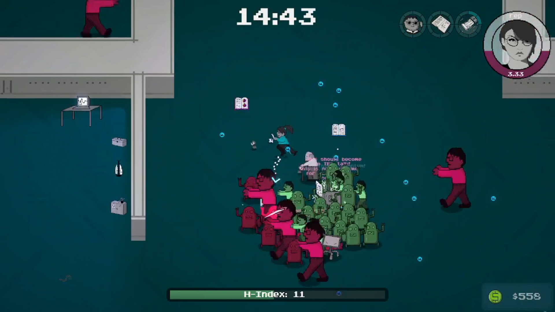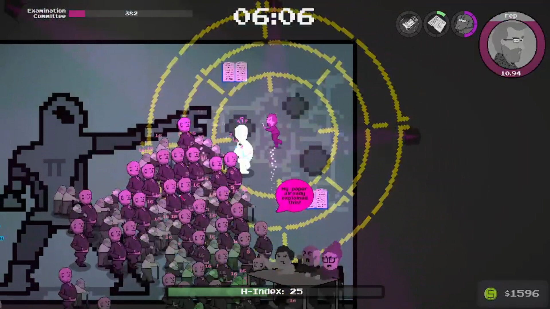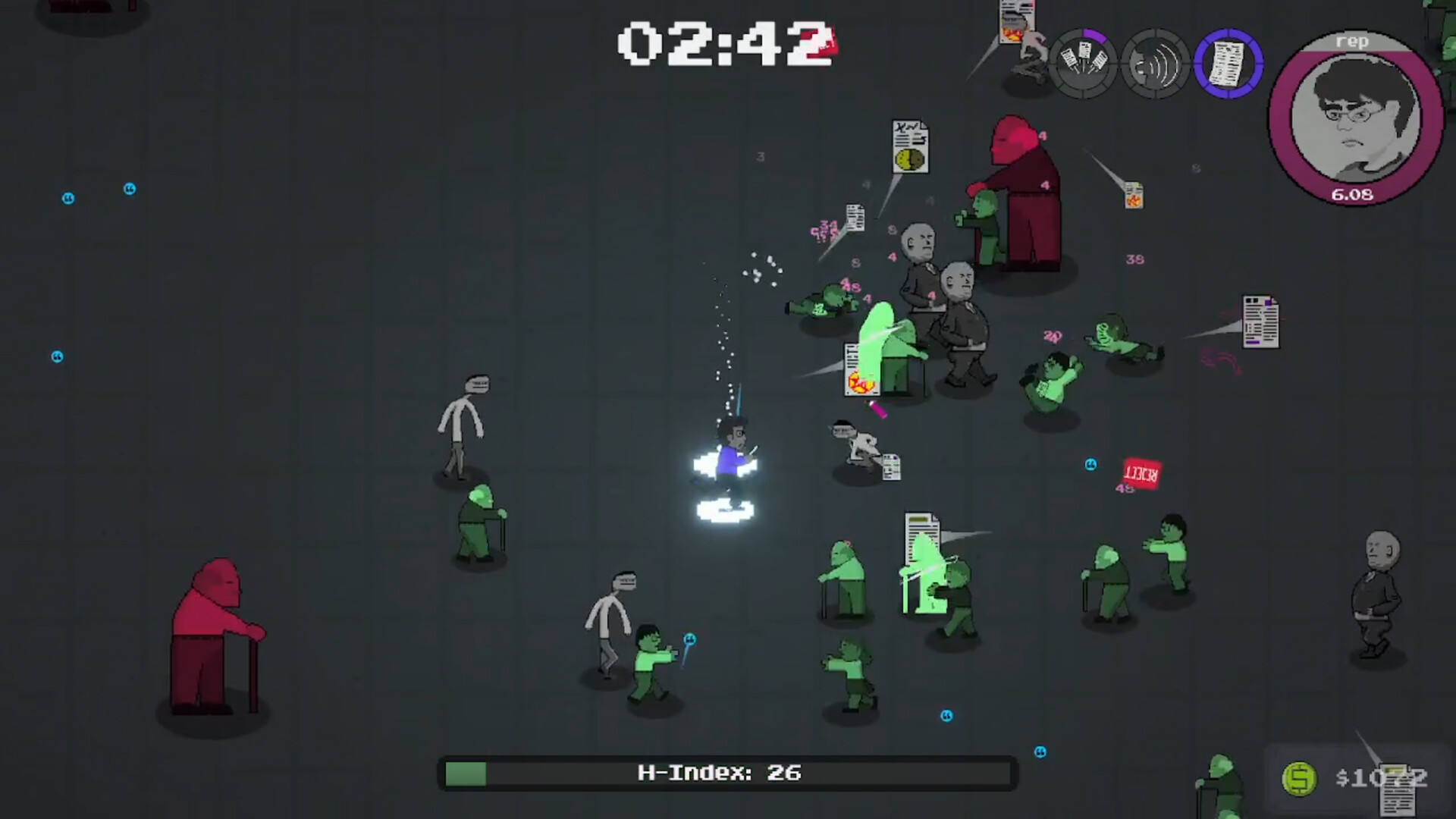 Publish or perish is a minimalist survival game with roguelite elements. It is themed in an academic setting where in order to stay in academia you will have to publish as many papers as you can within a time limit. Evade and defeat reviewers, employ nefarious schemes to increase you metrics quicker, unlock new academics. Can you make it to tenure?