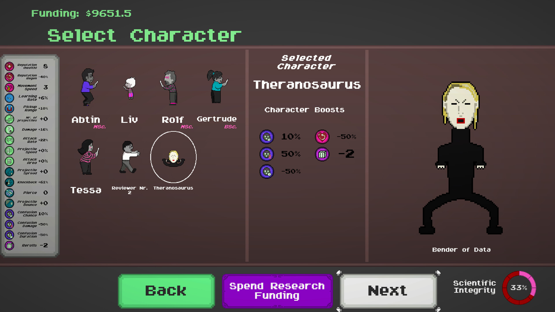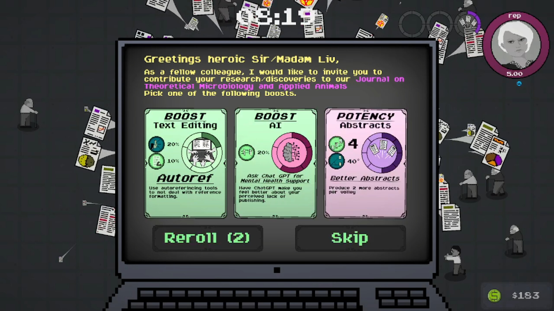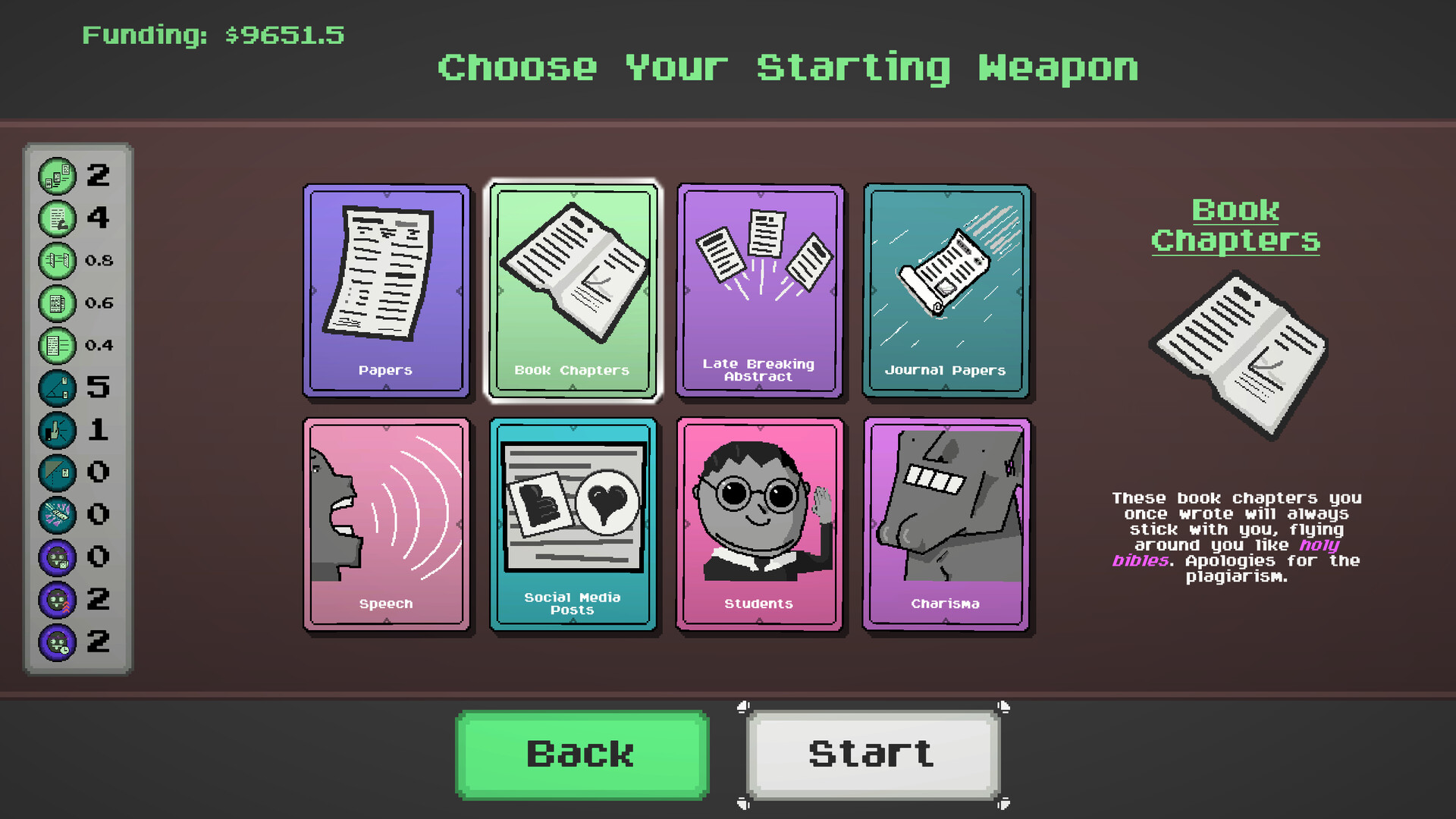 Publish or perish is a minimalist survival game with roguelite elements. It is themed in an academic setting where in order to stay in academia you will have to publish as many papers as you can within a time limit. Evade and defeat reviewers, employ nefarious schemes to increase you metrics quicker, unlock new academics. Can you make it to tenure?