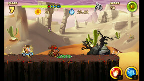 Это гонка-автораннер, т.е. машинка здесь едет сама, а мы — игроки — иногда прыгаем (надо суметь попасть на специальную платформы-пружинки, которые значительно ускорят авто) и используем различные инструменты, которые можно собрать по пути. Например, есть возможность подобрать нечто вроде огненного шара и подстрелить противника недалеко от пропасти: поскольку его машина будет повреждена, то он не прыгнет и улетит прямо в ямку. Локации разнообразные, а по мере продвижения открываются и другие инструменты.