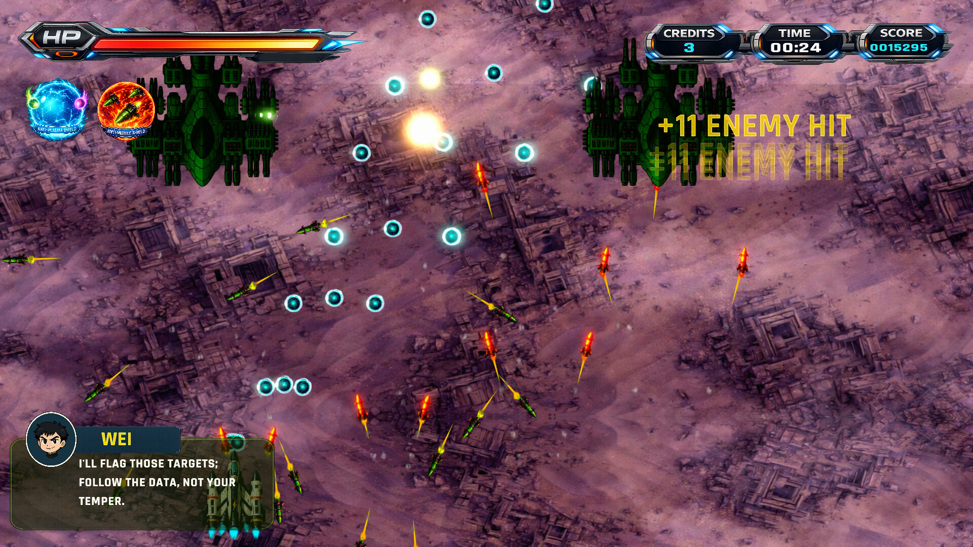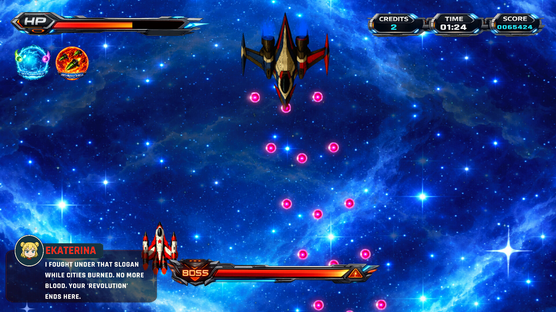 ВИЗУАЛЬНАЯ НОВЕЛЛА + SHMUP: история, движимая фракциями, идеологией и политическим конфликтом — с интенсивным экшеном между сценами.