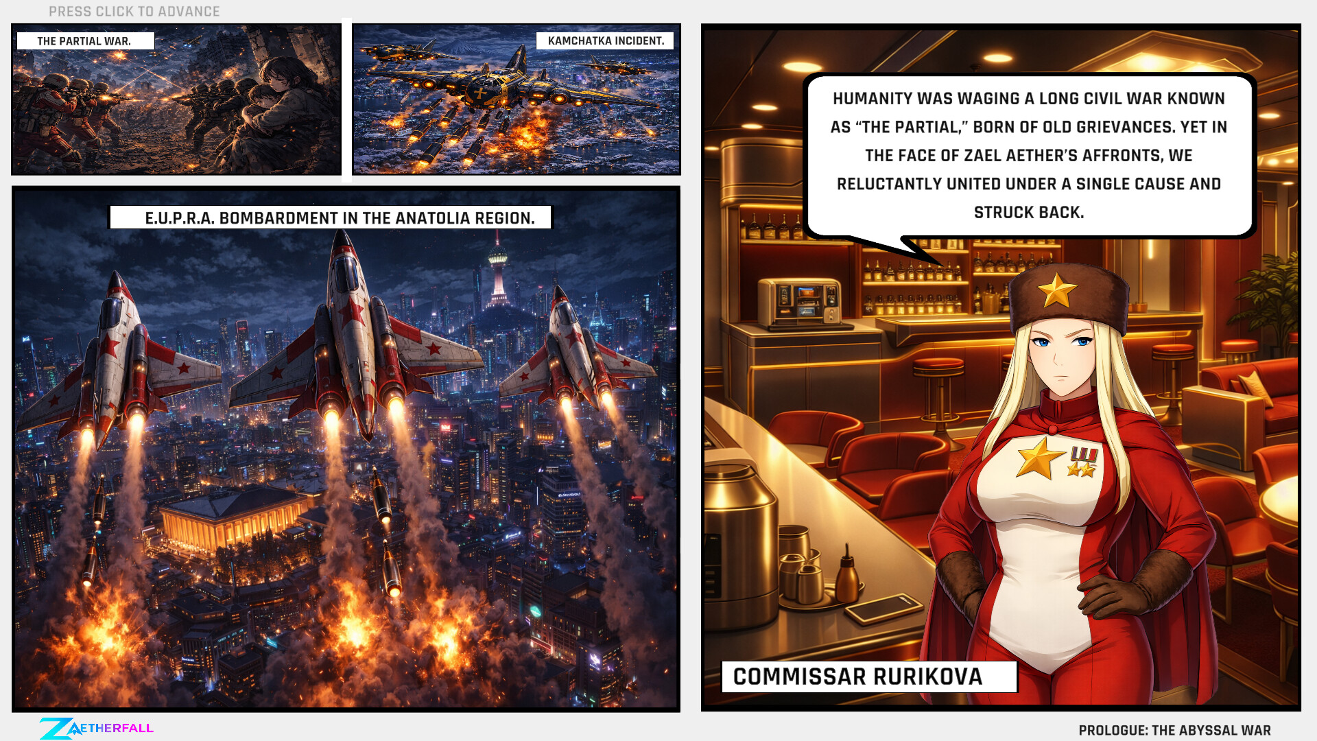 Zaetherfall — это визуальная новелла / shmup о войне фракций, пропаганде и решениях на грани. Три соперничающих аса — URA, EUPRA и Священный Восточный Доминион — вынуждены объединиться, когда Zael Aether наступает как абсолютная теократия, которая никогда не ведёт переговоров: она очищает.