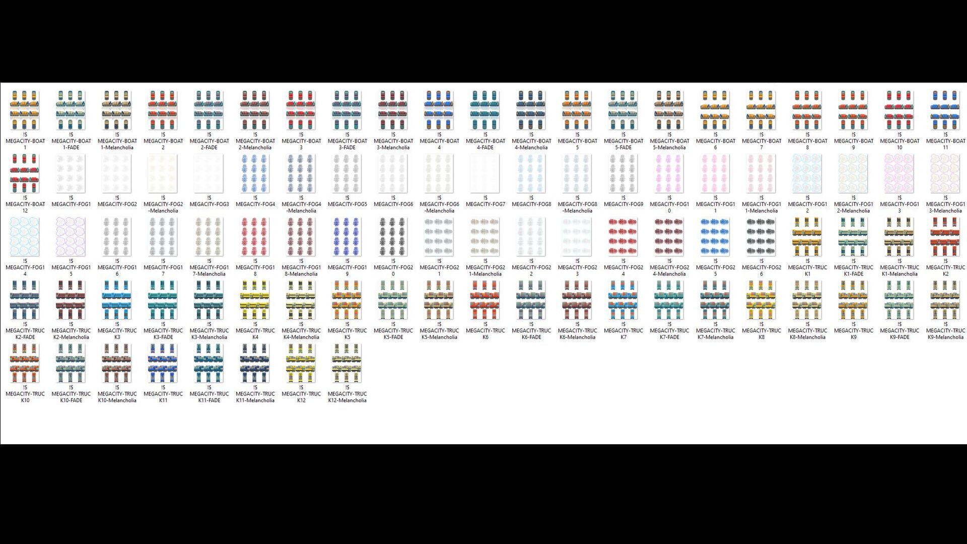 The set includes plenty of animations such as boats, trucks, and fog, along with a few experimental ones. Each animation is available in multiple styles, including fade, retro, melancholy, and color variations.