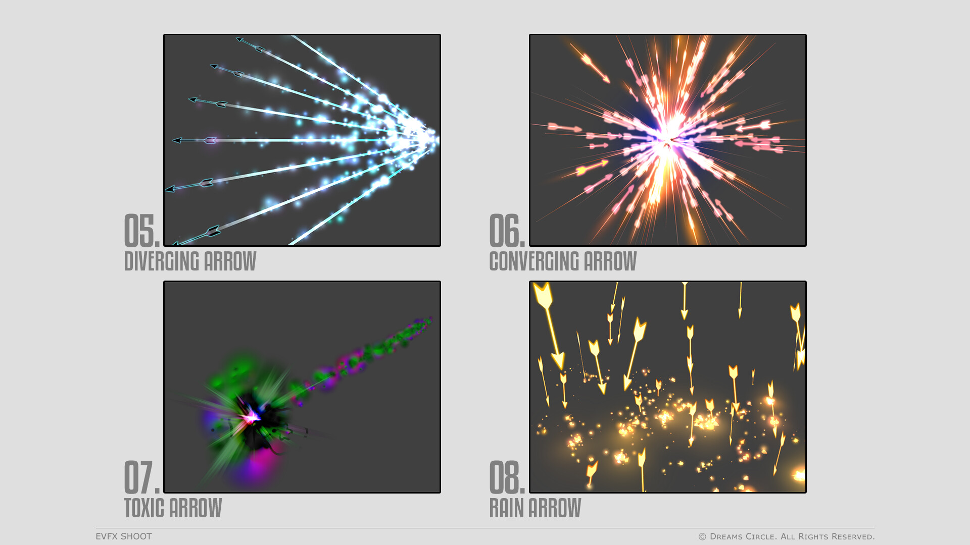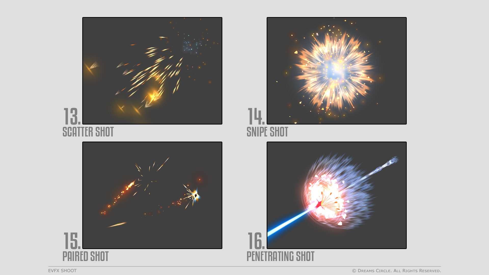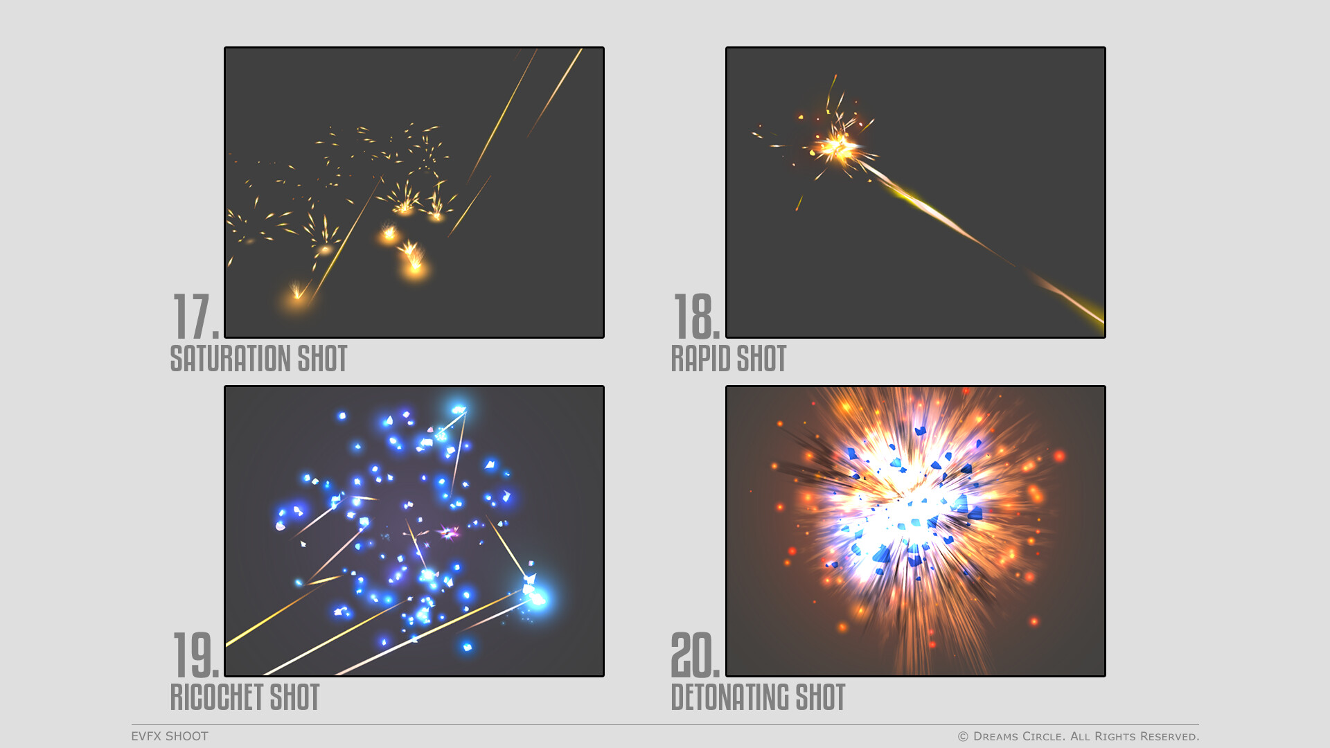 Designed by Dreams Circle, a team specializing in high-quality game assets, "EVFX Shoot" features 20 gorgeous visual effects AND complementary sound effects, allowing you to add that professional polish to your projects easier than ever before and awe your audience!