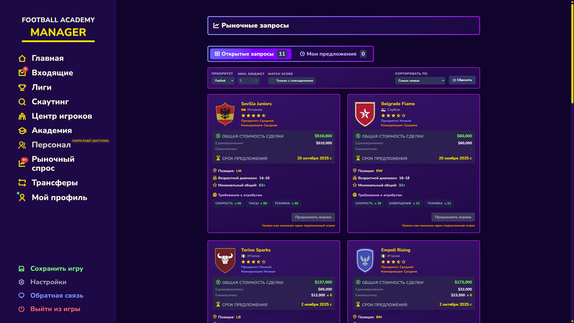 Смотри, какие профили нужны клубам, предлагай своих игроков, когда они подходят под запрос, и веди переговоры о трансферах, чтобы финансировать следующую волну.