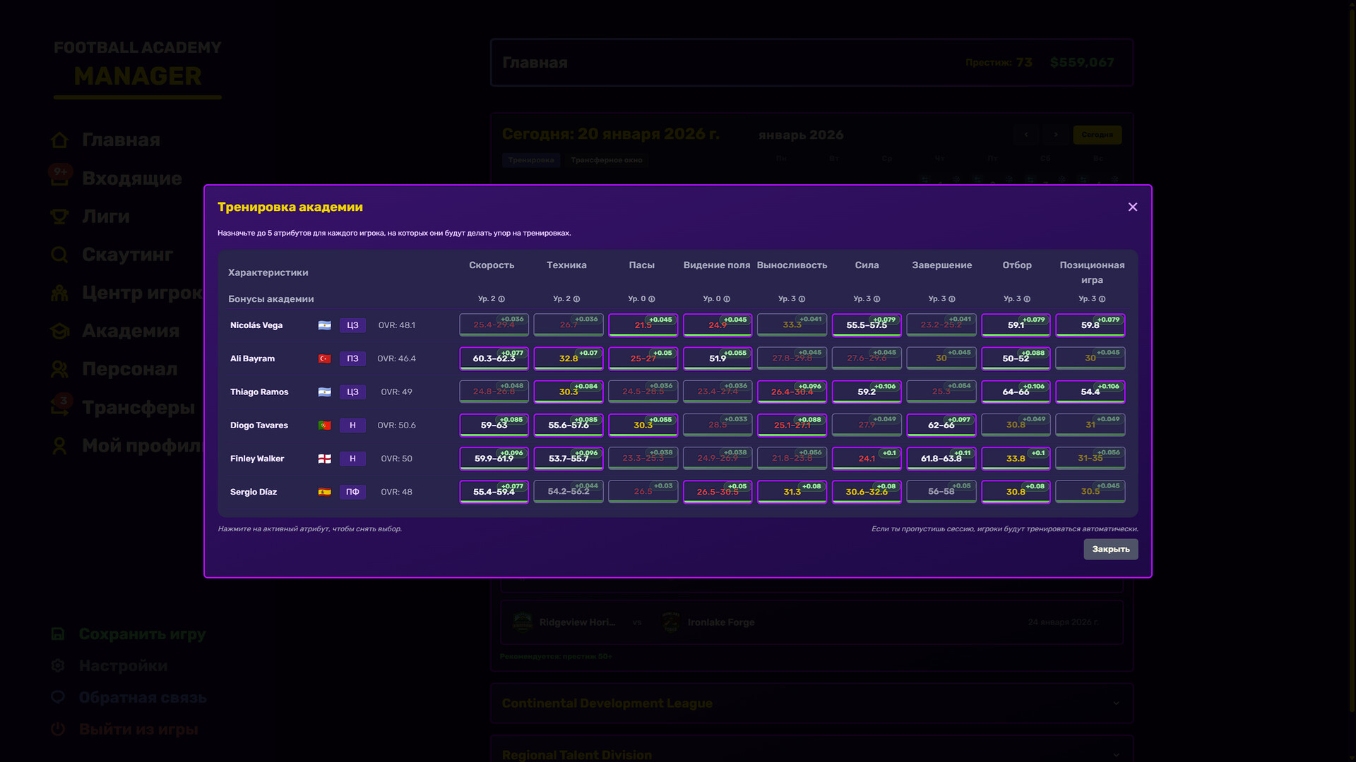 Выбирай фокус тренировки, прокачивай игроков со временем, и делай специалистов под разные роли.