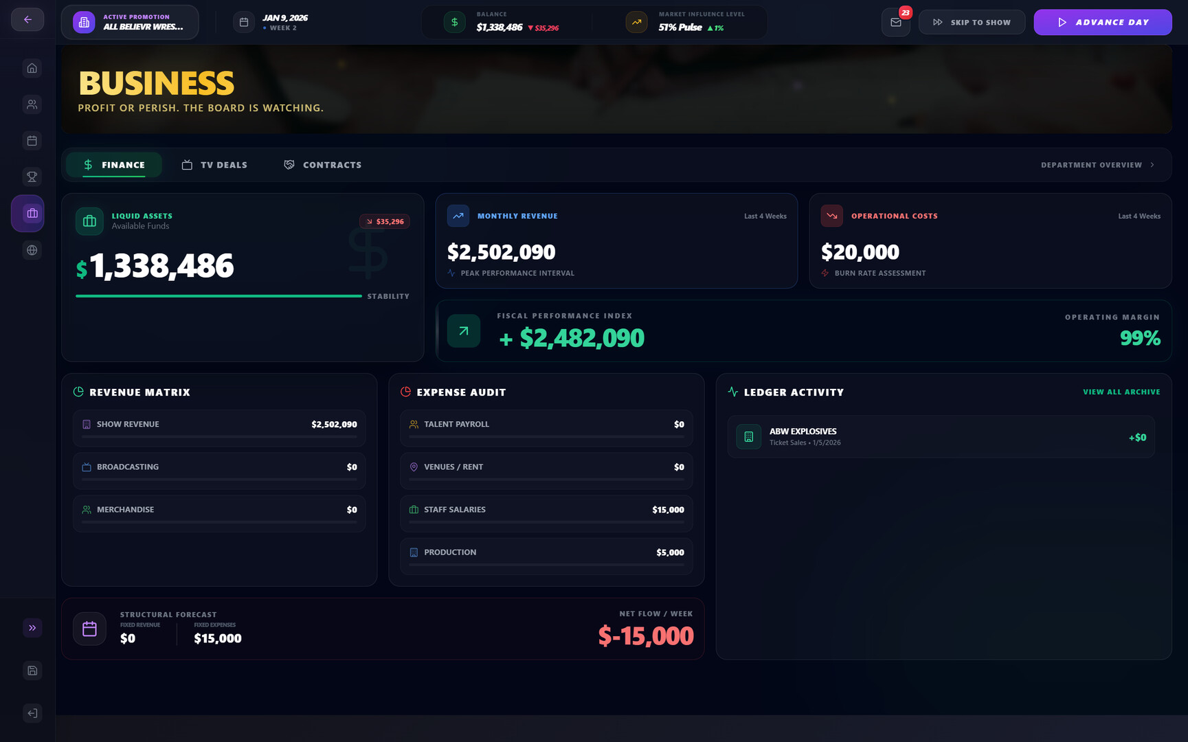 Book weekly shows and PPVs with full control over matches, promos, and segments