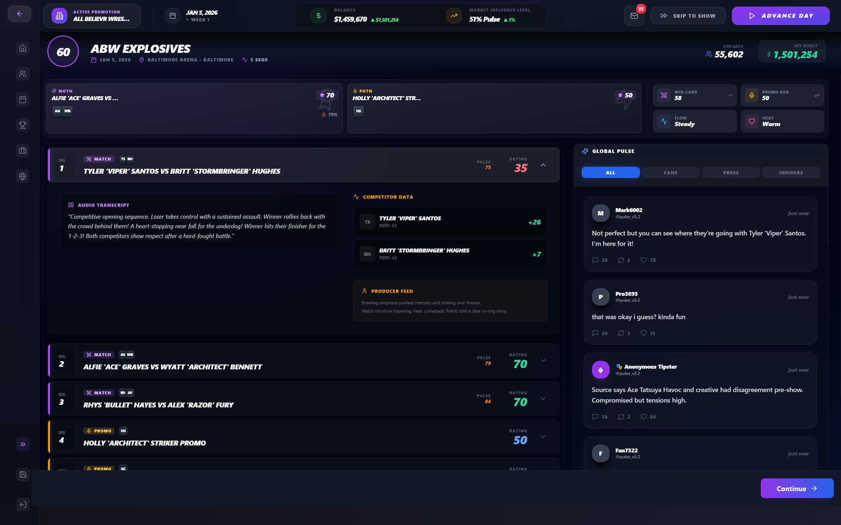Detailed show summaries and post-match reports explaining why things worked or didn’t