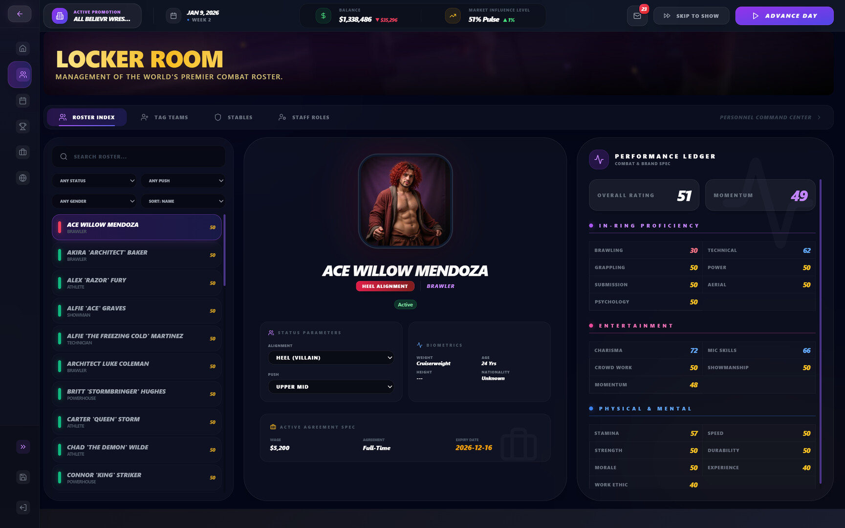 Manage wrestlers with momentum, morale, ego, popularity, and long-term development